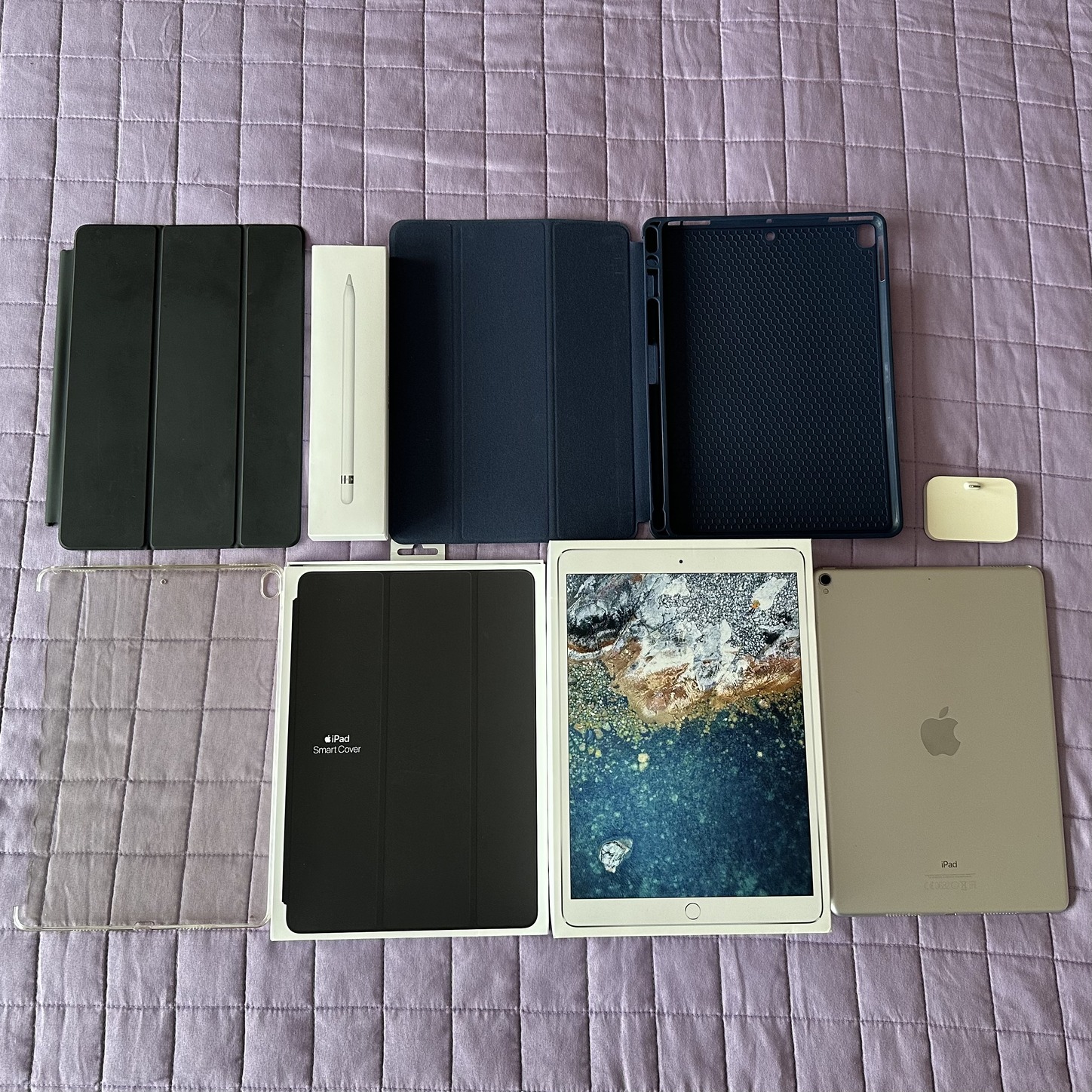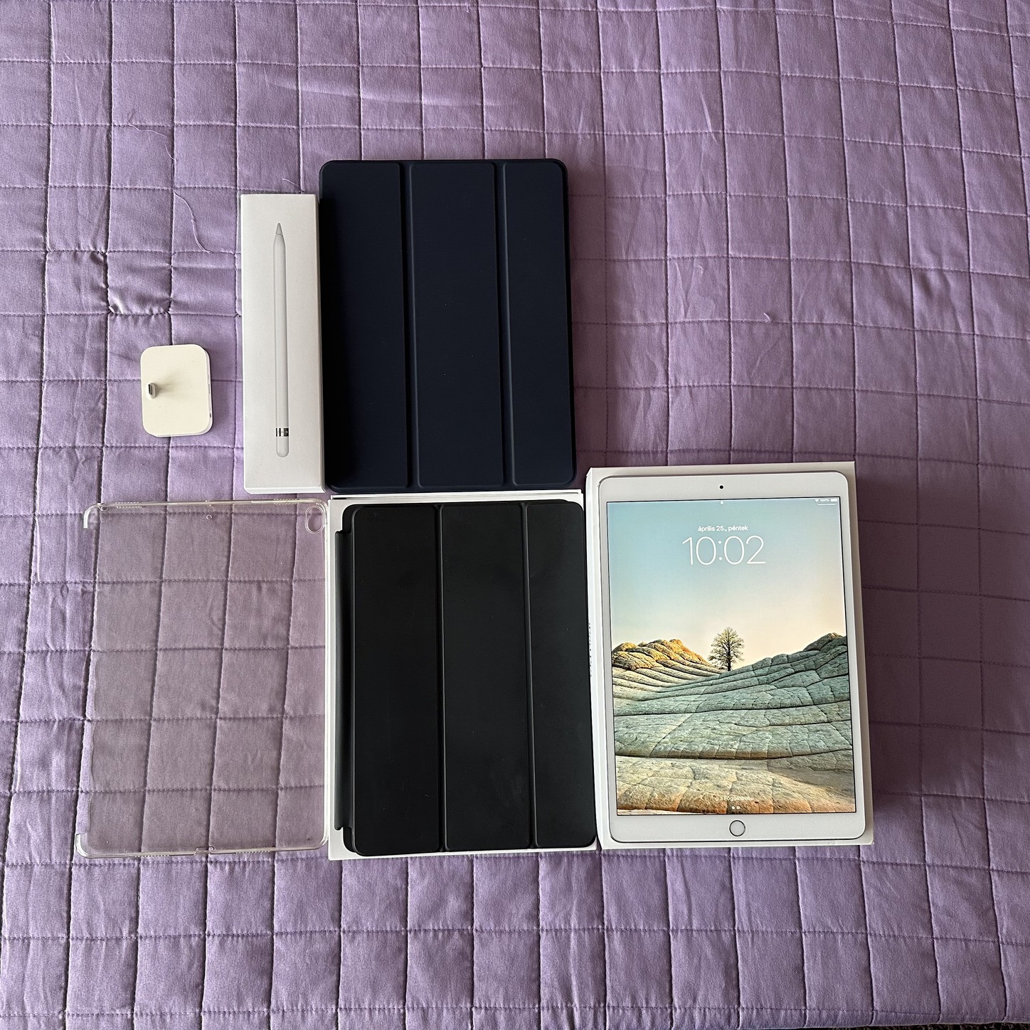 iPad Pro 10.5” Wi-Fi 256GB – bevizsgálva, új akkumulátor, fél év akkumulátor garanciával Újszerű Apple Pencil 1. generáció – 1 év garancia Újszerű Apple Smart Folio tok Extra teljes védőtok és tablet + Apple Pencil tartó (új) Használt hátlapvédő (Back Cover) – átlátszó, rugalmas Eredeti, újszerű Apple Lightning Dock (töltőállvány) Eredeti dobozok, töltő, új kábel