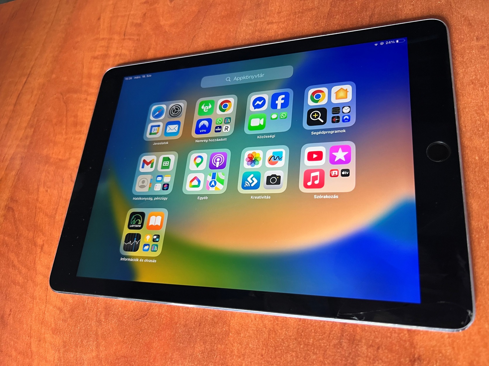 Apple Ipad Pro (9.7") eladó. Az egyik sarka sajnos le van ütve, és a kijelző üvegje ezen a sarkon megrepedt. Ez a sérülés régi, a működést egyáltalán nem érinti, már két éve így használom, bekapcsolt kijelzővel alig látszik. Ezen felül minden tökéletesen működik. Az akksija továbbra is jó állapotú, intenzív használattal is több óráig bírja, ezzel is abszolút elégedett voltam. (Azért adom el, mert újat, nagyobbat vettem.) Adok hozzá egy gyári Smart Cover fedőtokot is.