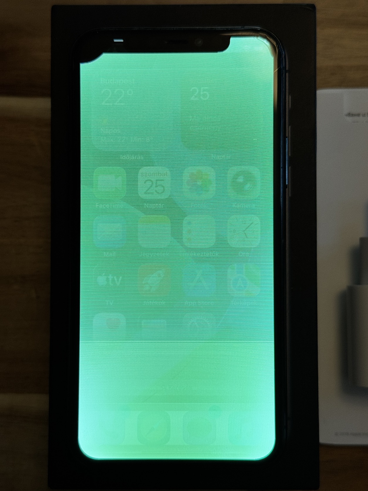 Kijelzőhiba: Amikor a háttérvilágítás bekapcsol, a kijelző teljes felülete fényes zöld árnyalatú lesz, a bal felső sarokban pedig egy körömnyi, állandó fekete folt látható (OLED oxidáció + COF kábel sérülés). A jelenséget fotókkal dokumentáltam. Komplett OLED modulcsere a megoldás, részleges üvegcsere itt nem opció.