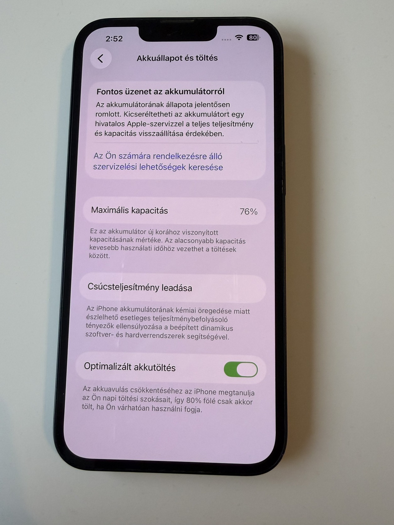 A készülék minden alkatrésze eredeti, tökéletesen működik, soha nem volt szervizben, semmilyen funkcionális hibája nincs. Külsőleg található rajta néhány apróbb használati nyom, ezeket fotóztam is. Az akkumulátor állapota 78%, a rendszer szervizelést javasol, csere ajánlott, de jelenleg is használható állapotban van.