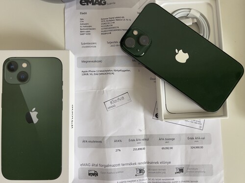 Eladó a képeken látható még kb. másfél évig garanciás, kártyafüggetlen iPhone 13, zöld színben. 89% os akku.