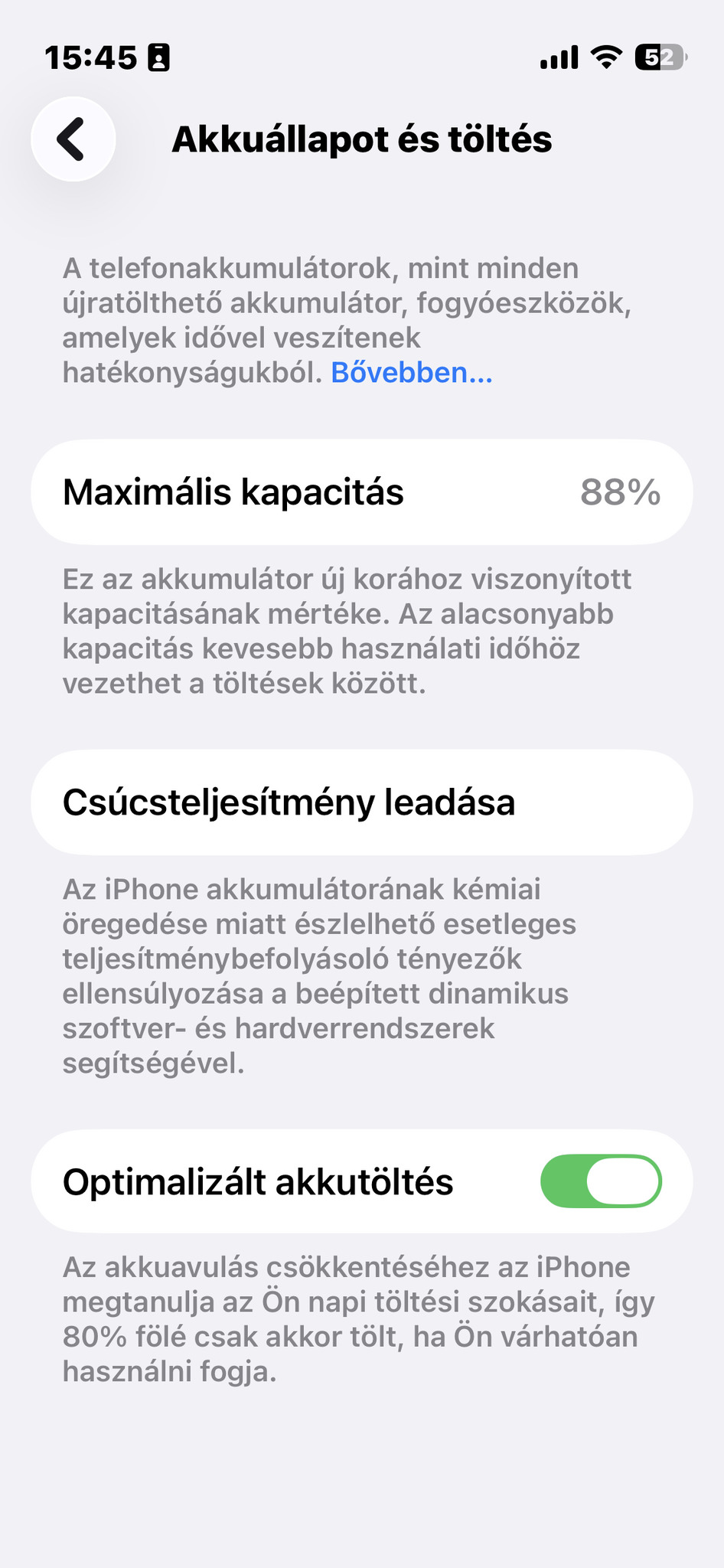 Akkumulátort kezdettől 20-80% töltöttség között használtam, talán ennek is köszönhető, hogy most eladás pillanatában is 88% az akkumulátor állapota.