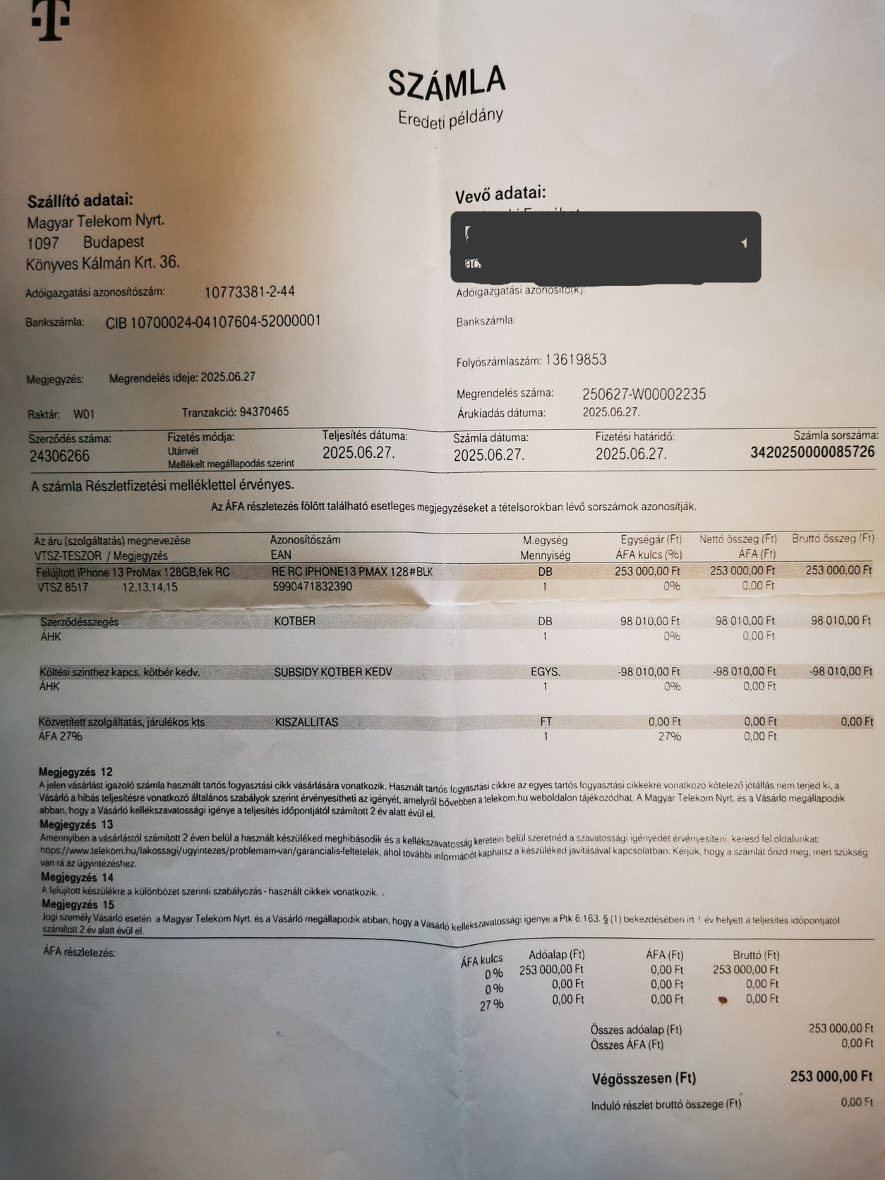 A garancia 2027. június 27-ig érvényes.