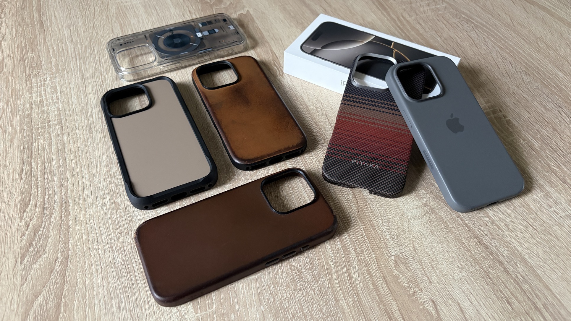 - A képen látható tokok a készülékhez járnak (2 db Nomad bőr, 1 db Nomad Rugged, 1 db gyári Apple szilikon, 1 db Pitaka, 1 db Spigen Zero)