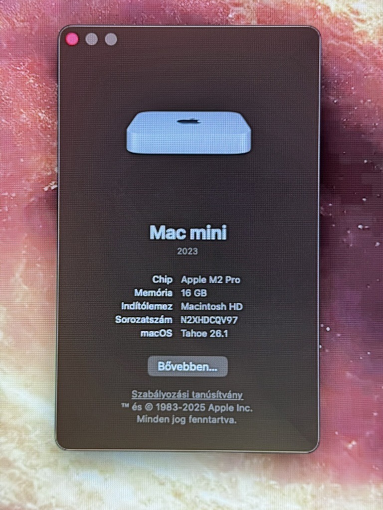 Eladó egy kitűnő állapotban lévő Apple Mac Mini M2 Pro. A gépben 16 GB RAM és 512 GB SSD van. Dobozában tápkábellel, valamint egy hozzá vásárolt dokkolóval.