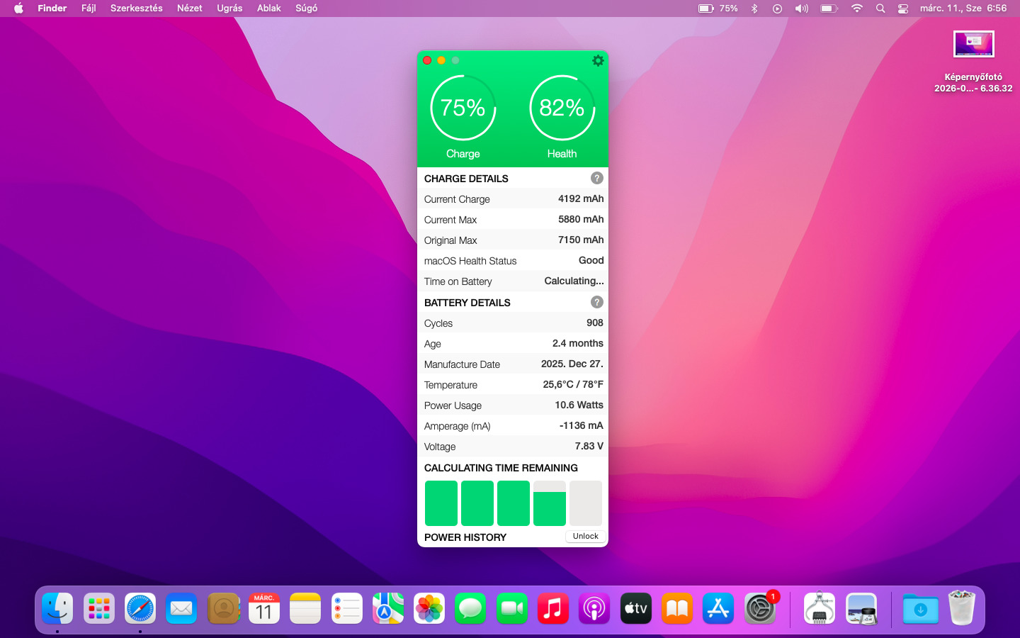 Állapot: 82% (Good) Töltési ciklus: 908 Jelenlegi kapacitás a képen látható