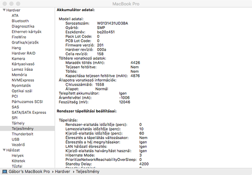 Az akkumulátora 85%os a Coconut battery alapján. Két töltő jár a gép mellé, egy gyári és egy utángyártott. Sajnos a gyári nem működik azonban javíttatható.