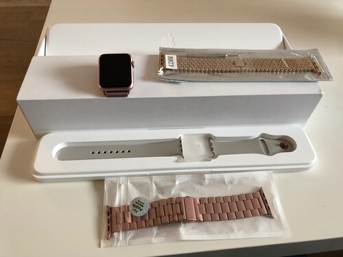 Eladó egy nagyon szép, megkimélt állapotban lévő, 1. generációs, rozé arany színű Apple Watch. Minden gyári tartozéka meg van, doboz, töltő, stb. A gyári szíj mellett még van 3 db fém szíj hozzá, amit adok mellé.
