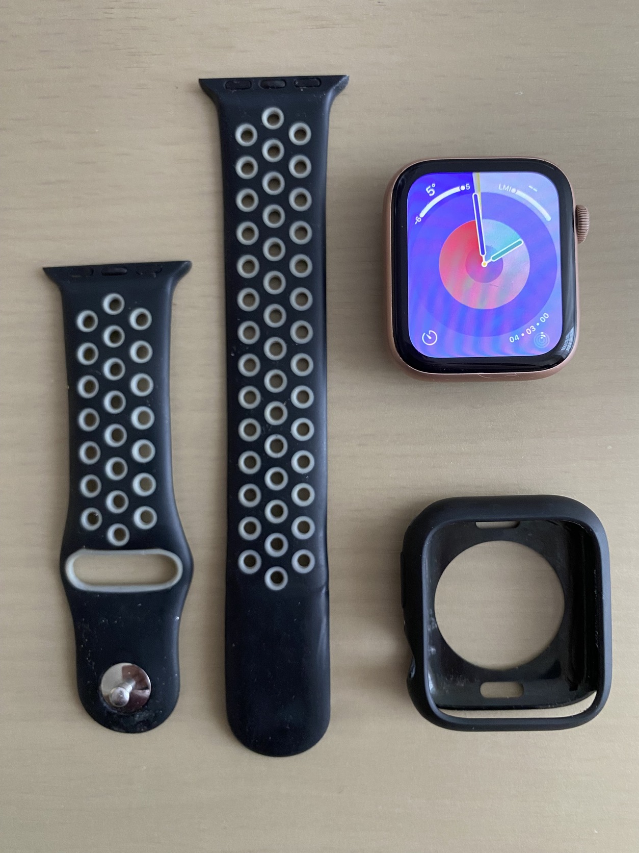 Amit tudok hozzá adni, az egy viseltes fekete gumis pánt, ami sajnos 40-es modelhez van, így egy kis rés van az óra széle és a pánt közt; egy védőtok, gyári töltő.