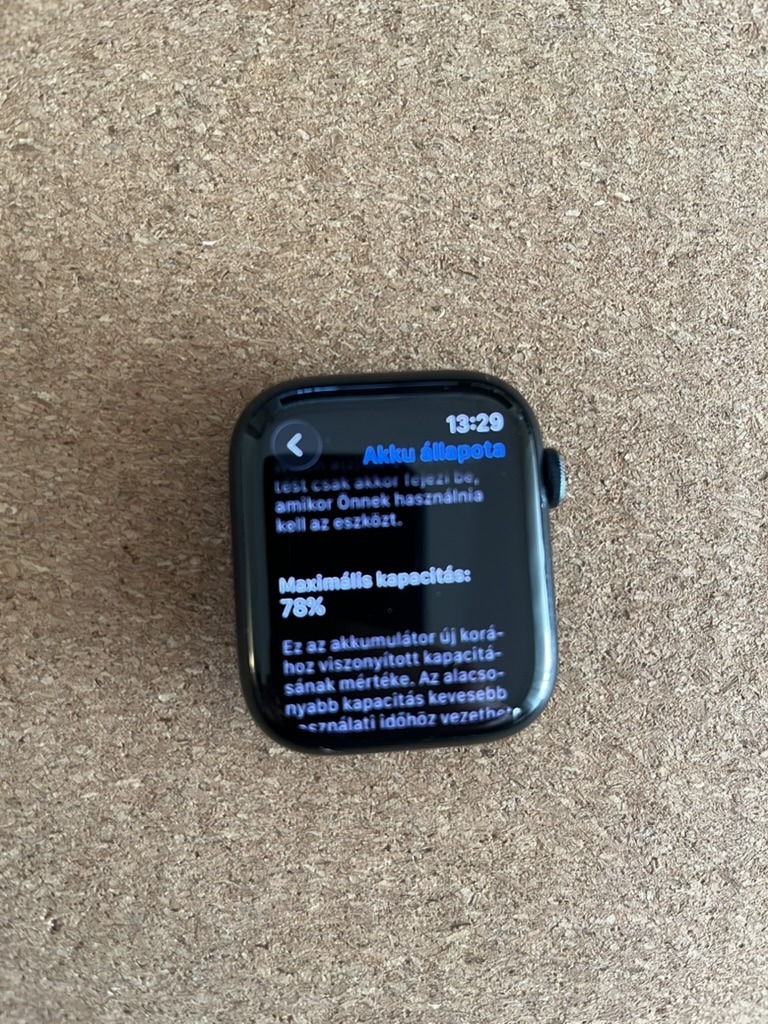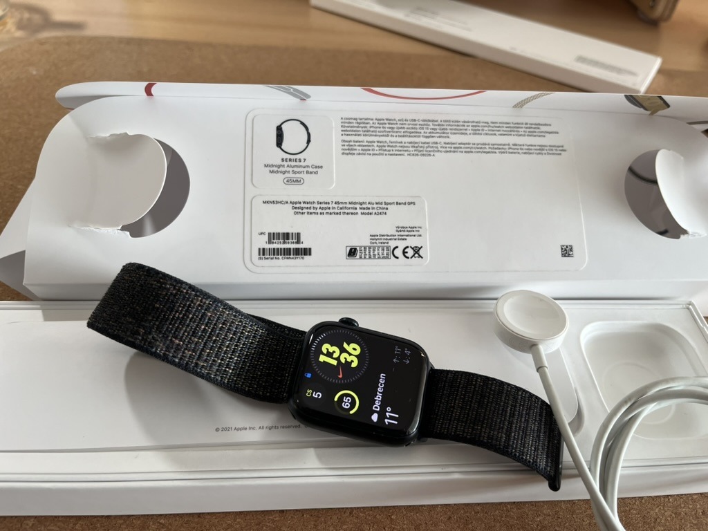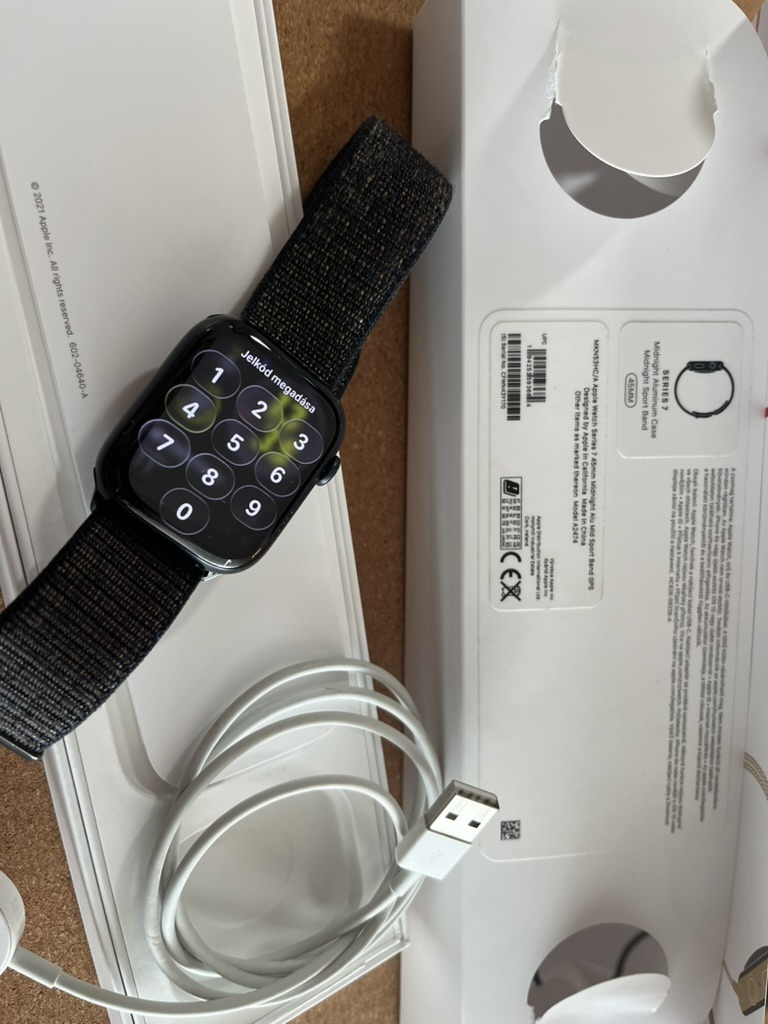 Apple watch 7 45 mm normál állapotban, jobb alul egy pontszerű ütődés alig észrevehető (harmadik kèp)Jár mellé a doboza, töltőkábel és a képen látható szövet szíj. Az aksi 78%-os jelenleg.