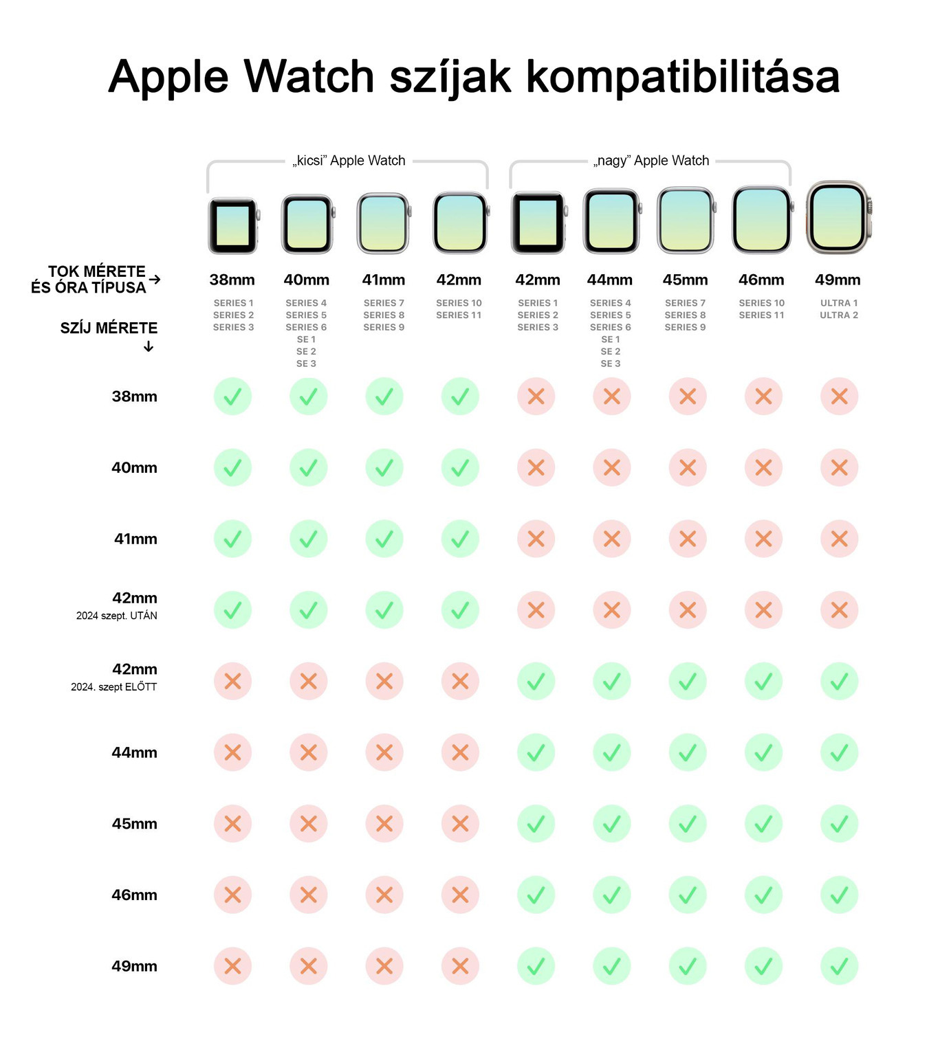 Kompatibilis tokméretek (képek között táblázat): 42 (kizárólag Series 10) / 41 / 40 / 38 mm