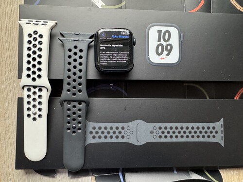 Eladó a képeken látható Apple Watch 7 45mm Midnight Aluminium Nike órámat dobozával, töltőjével, egy fekete és egy fehér szíjjal!