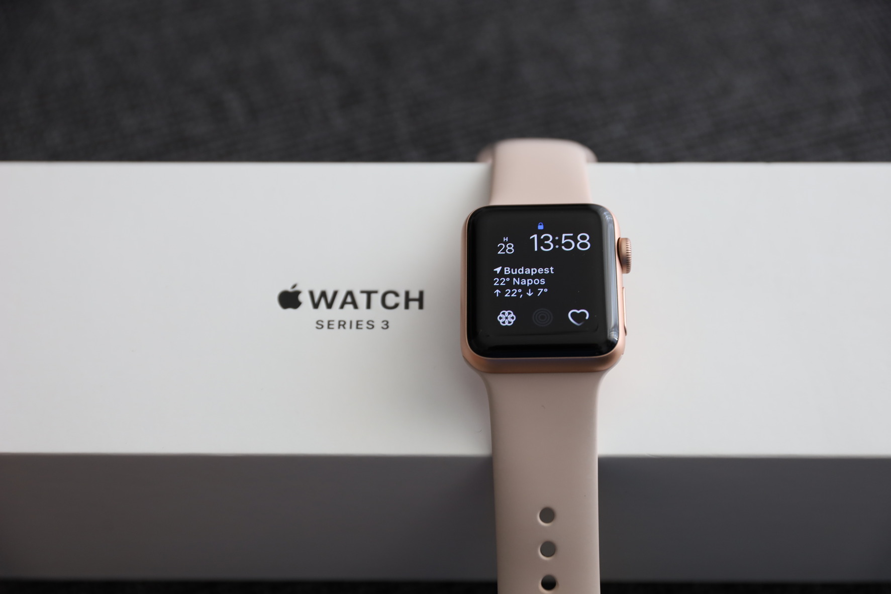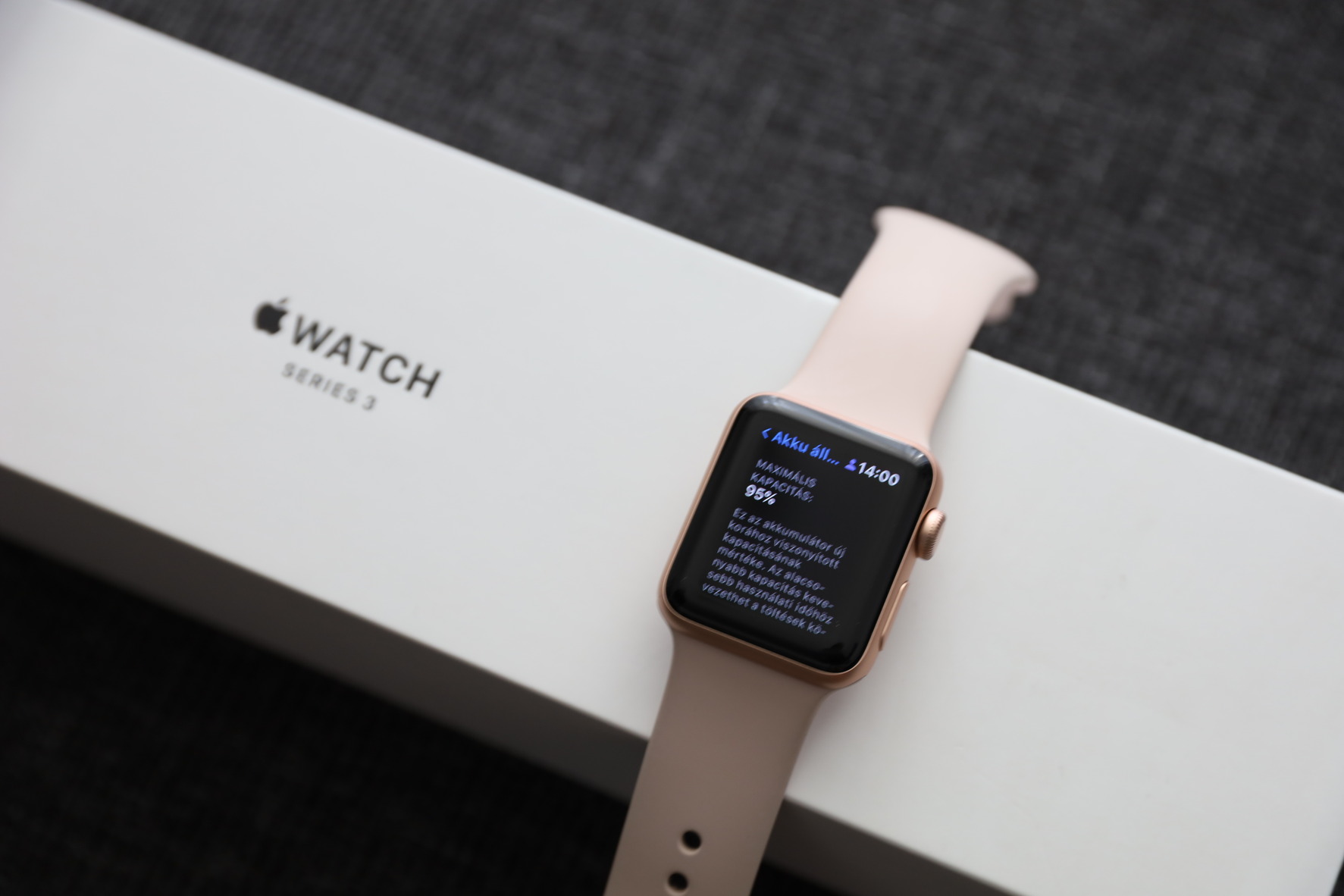 Eladó szép állapotú Apple Watch S3 (Series 3), 38 mm méret, Gold Aluminium Case, Pink Sand sport band.