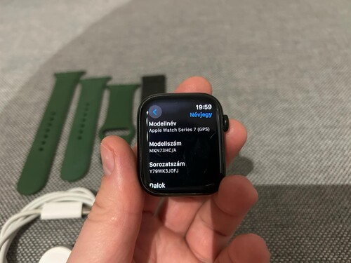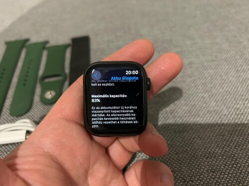 Jár hozzá a Type-C töltőkábel, az eredeti zöld, szilikon szíj, valamint egy mágneses fém szíj (utóbbi szintén viseletes)