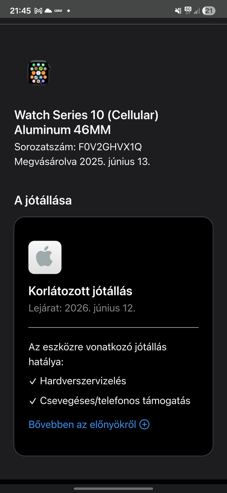 Az óra tökéletesen működik, le van választva az iCloud fiókomról, és frissítve van a legújabb szoftverre. Azonnal használatba vehető!