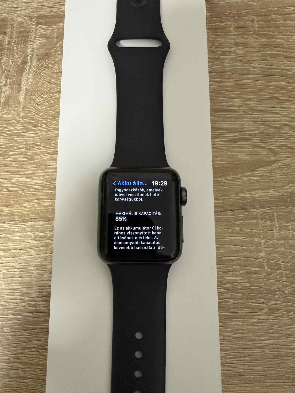Az óra 85%-os akkumulátor-állapottal rendelkezik, ennek megfelelően még nagyon jól bírja a használatot.