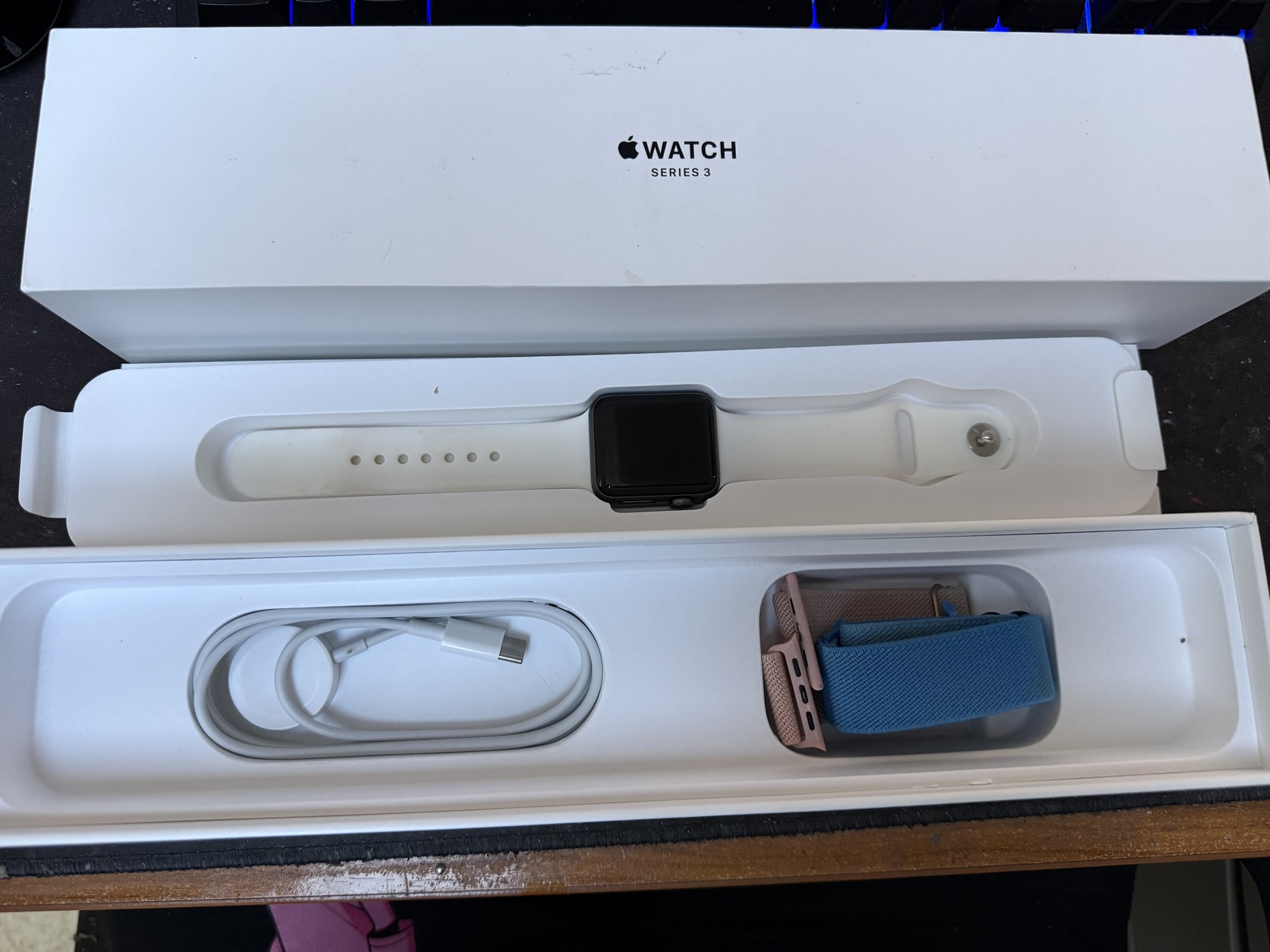 Jár hozzá a doboza 3db utángyártott szíj és egy utángyártott USB-C töltő kábel is.