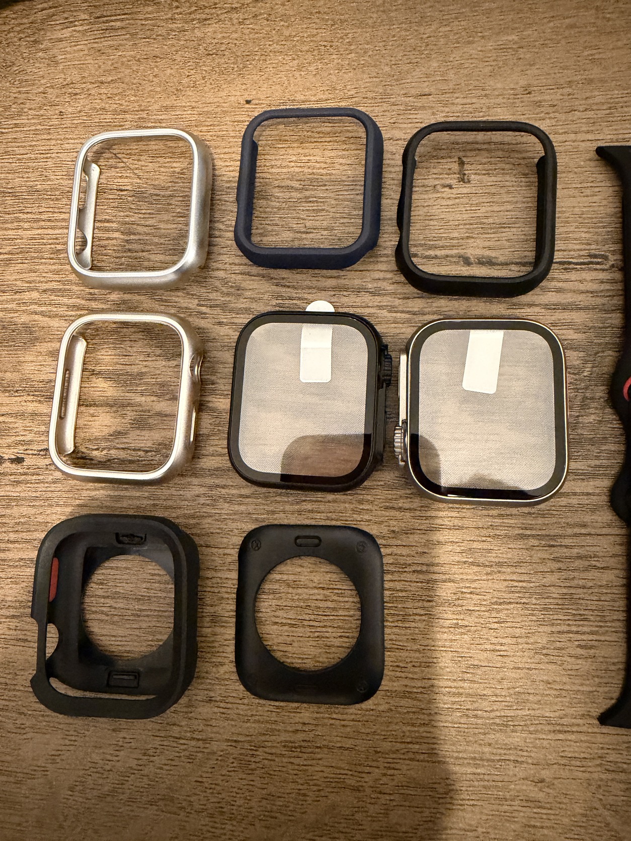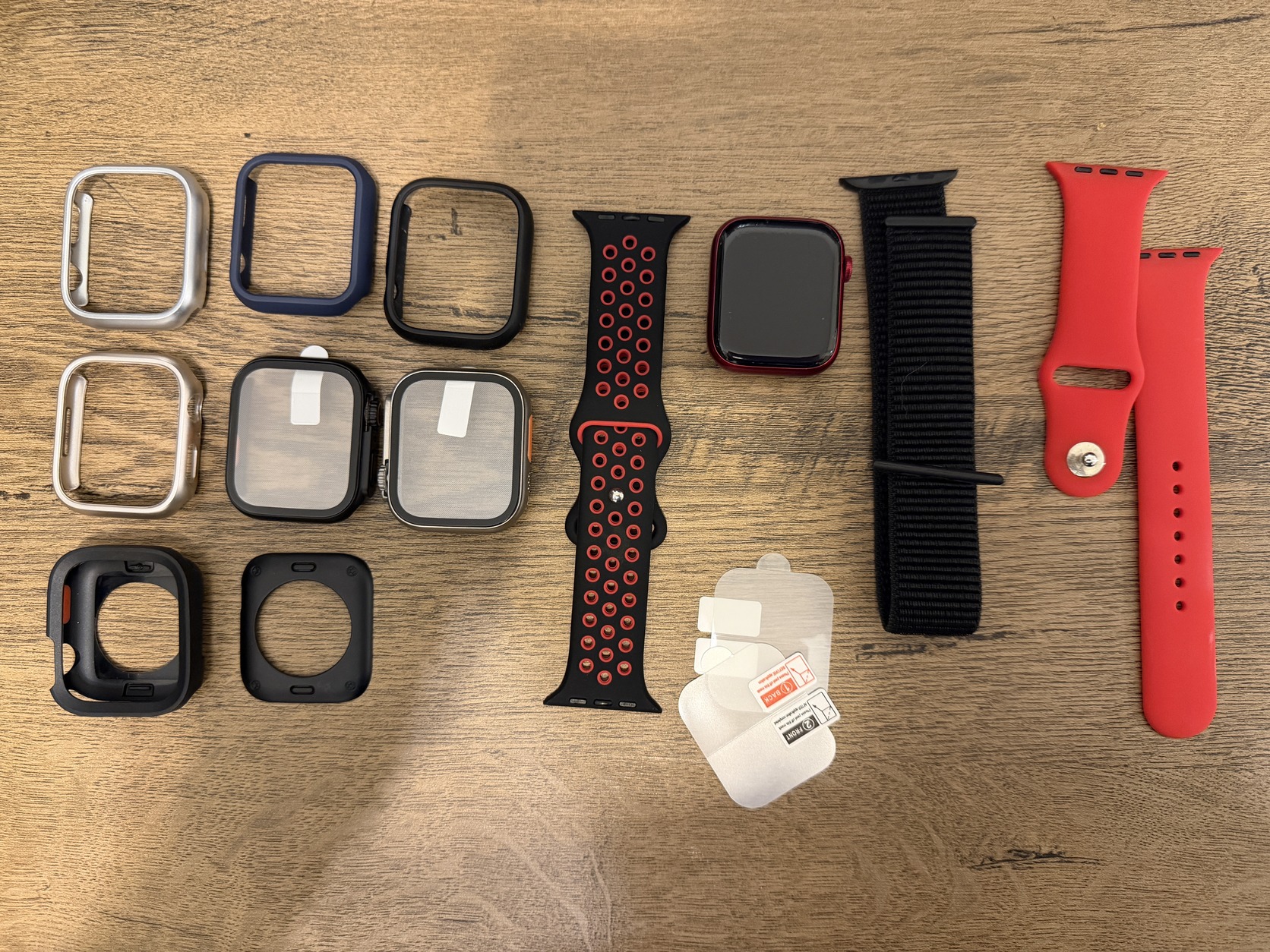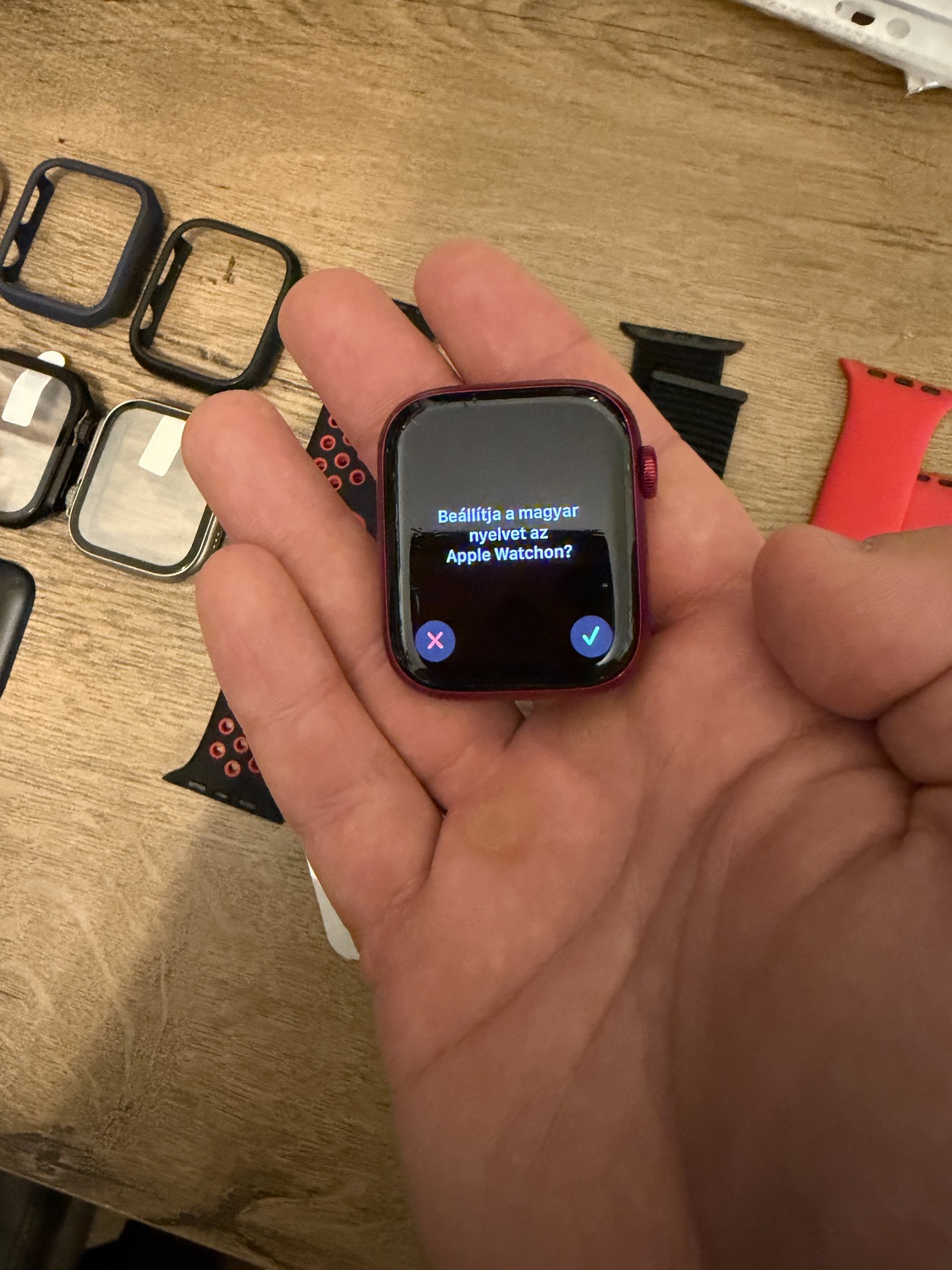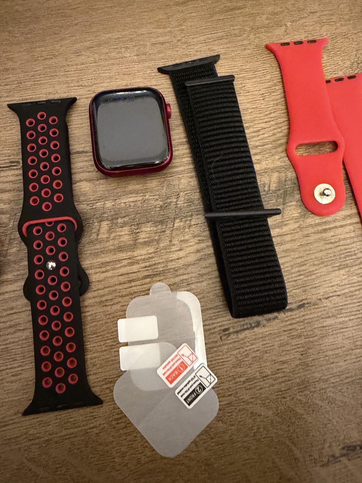 Eladó megkímélt, karcmentes Apple Watch Series 7 (45 mm, GPS, piros szín, új szíjakkal, tokokkal, kijelzővédő fóliákkal).
