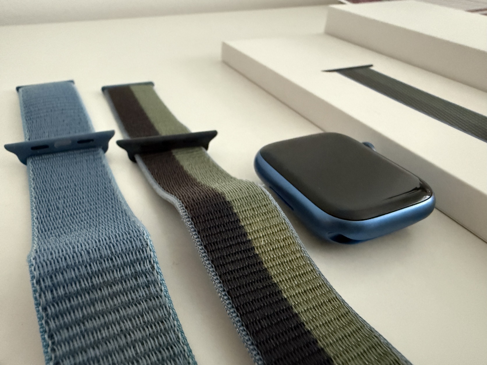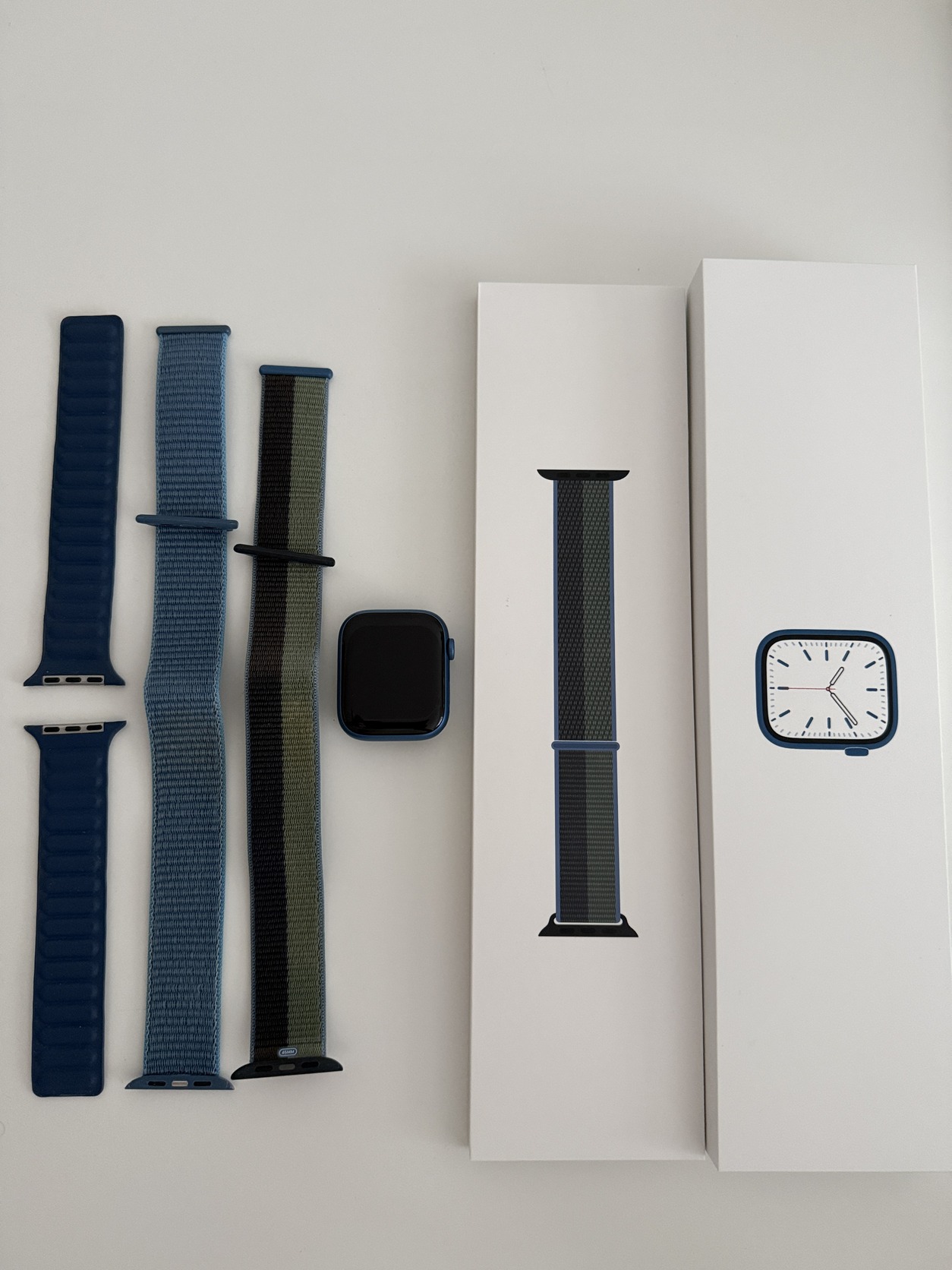 Eladó 3,5 éves Apple Watch Series 7 45mm Blue Aluminium GPS óra gyári Sport Looppal (Midnight/Eucalyptus).