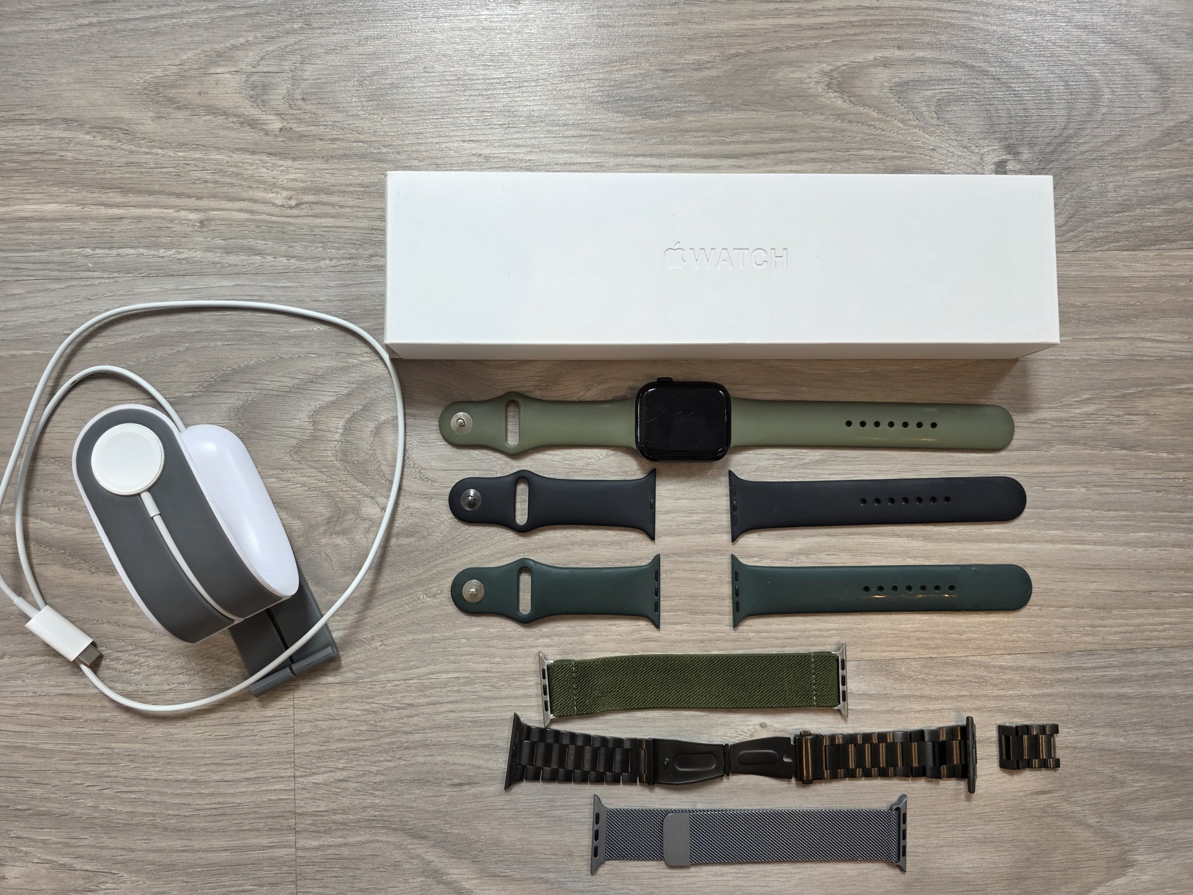 Eredeti doboza, extra szijjak, eredeti töltő és hozzá egy töltő tartó állvány.