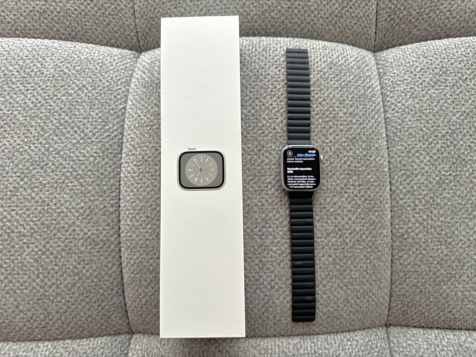 Eladó egy újszerű állapotú Apple Watch Series 8. Kétoldalasan használható mágneses szíjjal. Doboz, töltőkábel, minden tartozéka megvan. Alzánál vásárolt (2023. december). A kijelzőn egyetlen apró, alig látható karc található (nem mély), fényképezni is nehéz volt. Szemből egyáltalán nem látszik. Az akkumulátor 86%-os. (Képek között megtalálható)