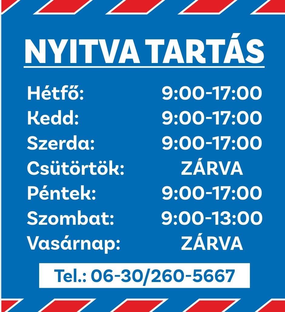 Nyitva tartás: H-K-Sz-P:9-17.óráig.Cs:Zárva.Szo: 9-13 óráig