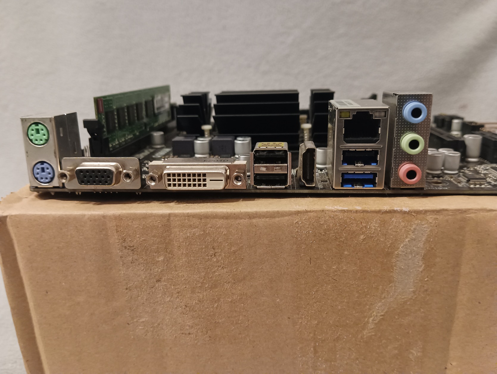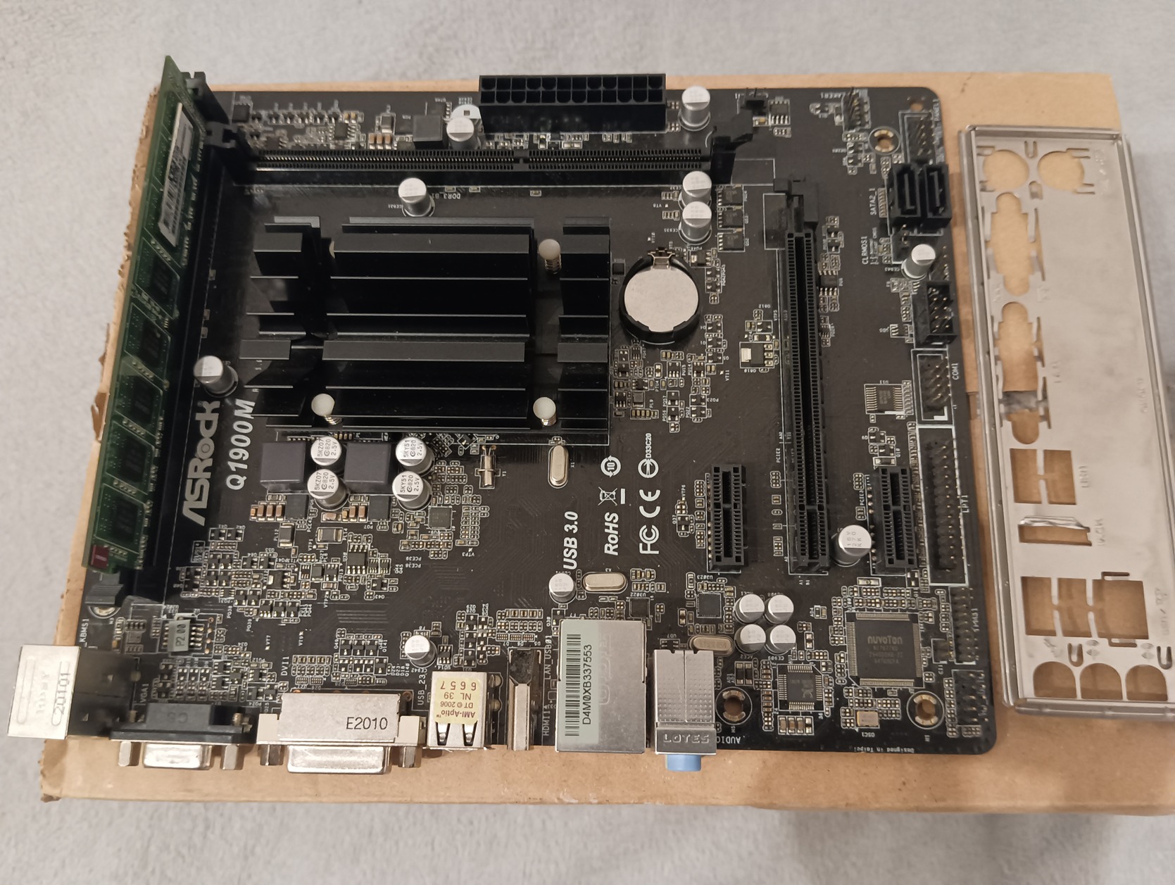 Eladó a képen látható ASRock Q1900M integrált processzororos alaplap hátlappal, 1x4gb DDR3 memoriával.