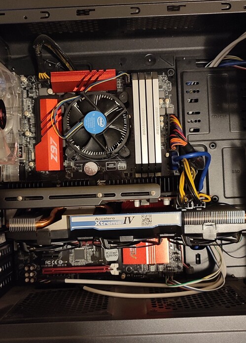 Asrock Fatal1ty Z97 Killer alaplap, i7 4790K processzor 4x4 GB Corsair Dominator Platinum DDR3 memória, Samsung 970 Evo Plus 240 Gb SSD, AMD R9 290X videokártya, Arctic Axelero IV hűtéssel, Cooler Master 600 Wattos táppal.