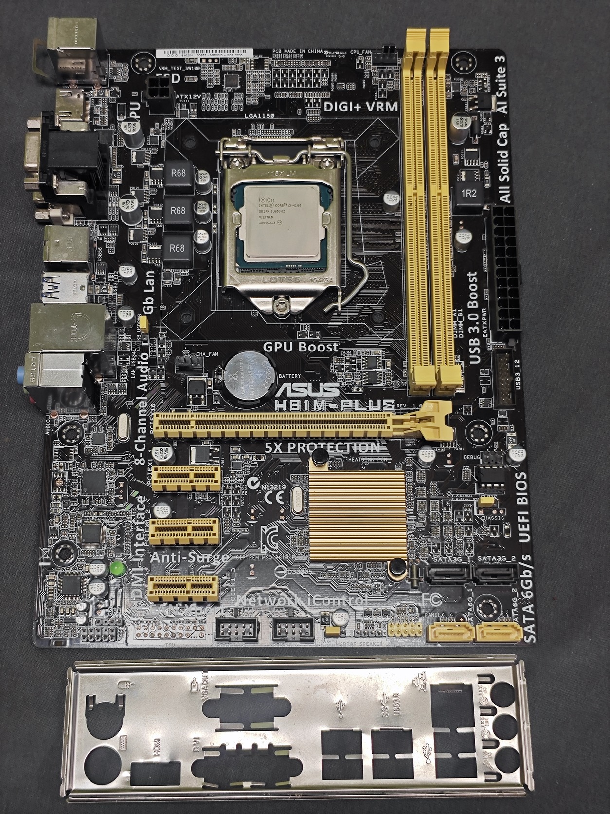I/O shield jár mellé illetve egy I3 4160 is. A proci nem egy erőgép, de SSD mellett simán elvégzi a könnyebb feladatokat.