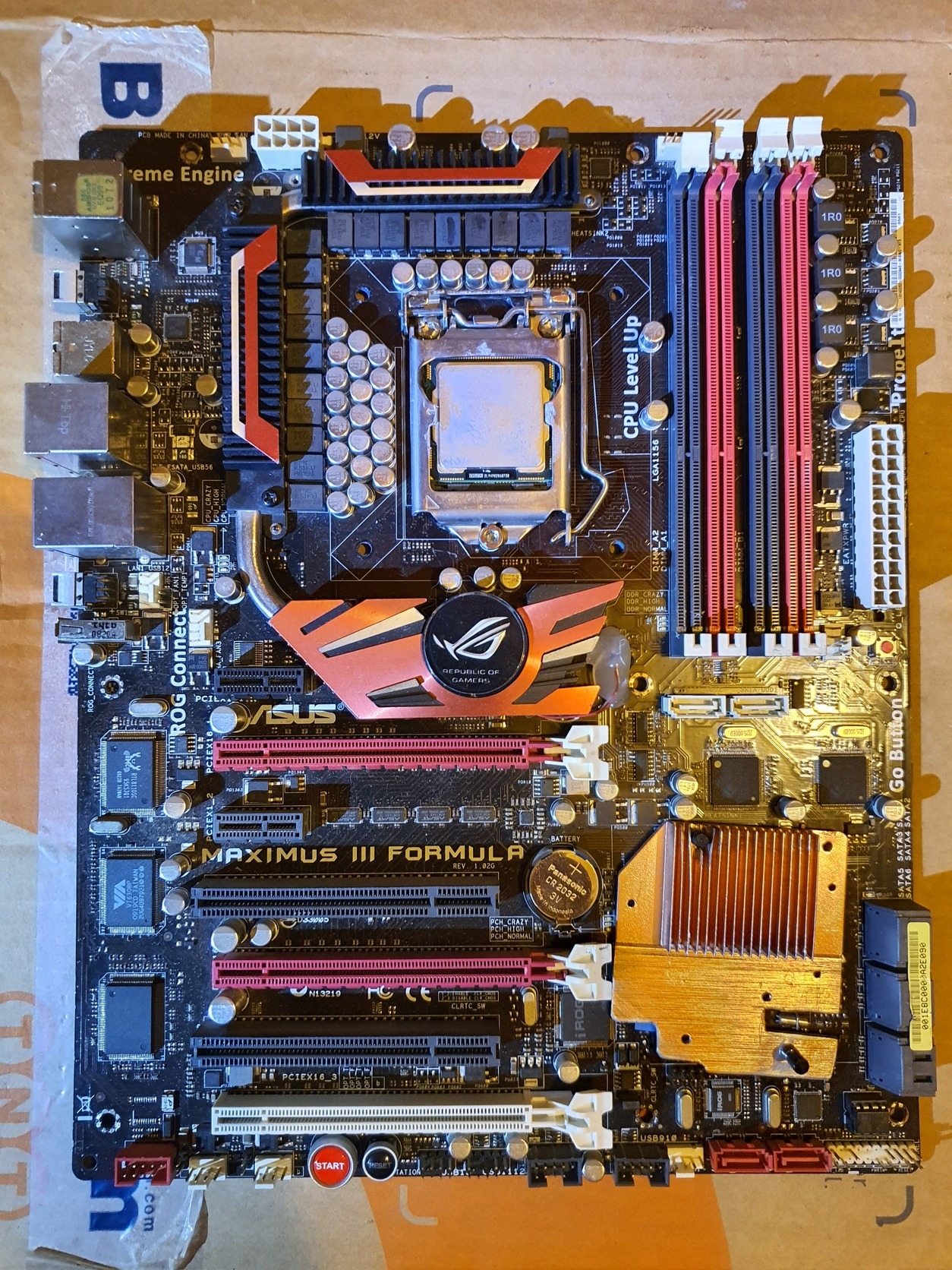 Képeken látható állapotban, az Intel alaplap működik rendben. Az asus-al emlékeim szerint voltak problémák/anomáliák. Végül úgy emlékszem extra szigeteléssel (hátoldal méretű antisztatikus zacskó) felcsavarozásnál a hátoldal és a lap közé működött és használva volt kb.1 évig egy x3440-el 3.4-3.6ghz-en. A tákolás erre vonatkozik és a világító logó bekötésére ami el is szakadt talán.