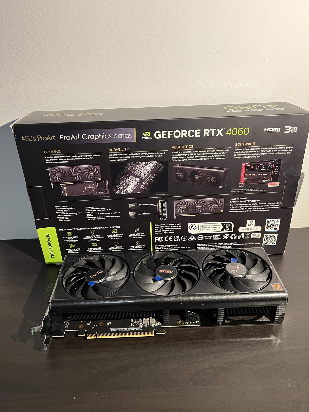 Eladó a képeken látható ASUS ProArt RTX 4060 OC 8GB-os videokártya dobozával.