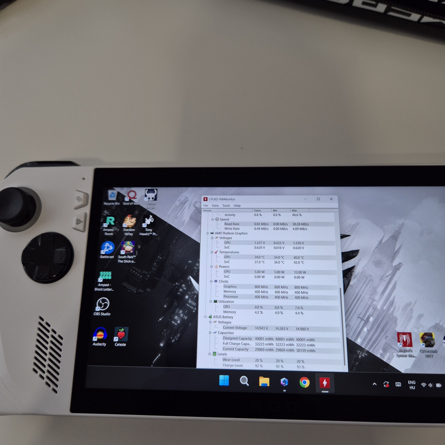 Minden gyári, 512GB-os SSD, 40Wh-s akksi (HWMonitor szerint még 32Wh van benne).