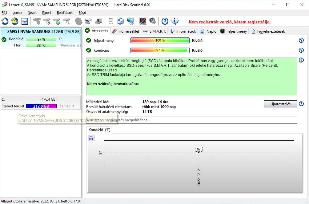 SSD: M.2 Nvme 512Gb Samsung SM951 (2016-ban az első szériás Nvme SSD, Gen. 1.1, hát nem egy mai darab, egy 970 pro 4 másodpercel leveri, HDD sentinel 97%-os a kondíciója)