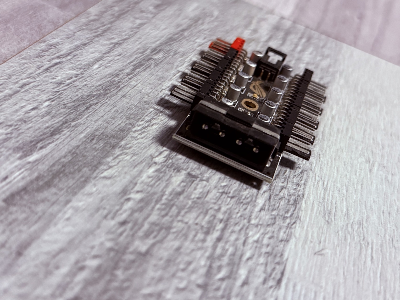 Ez egy PWM ventilátor elosztó hub, amely lehetővé teszi, hogy több (akár tíz) 4-tűs ventilátort csatlakoztass egyetlen alaplapi ventilátor csatlakozóhoz. Funkció: Lehetővé teszi az összes csatlakoztatott ventilátor sebességének egységes vezérlését az alaplapon lévő egyetlen PWM jel alapján.Csatlakozók:Tíz darab 4-tűs ventilátor csatlakozó (a 3-tűs ventilátorok is működnek, de teljes sebességgel).Egy piros színű, dedikált CPU ventilátor csatlakozó, amely visszajelzi a sebességet az alaplapnak.Egy bemeneti 4-tűs PWM csatlakozó, amellyel az alaplaphoz kapcsolódik.Egy SATA tápcsatlakozó (a képen a jobb oldalon), amely stabil tápellátást biztosít a sok ventilátor számára közvetlenül a tápegységből.