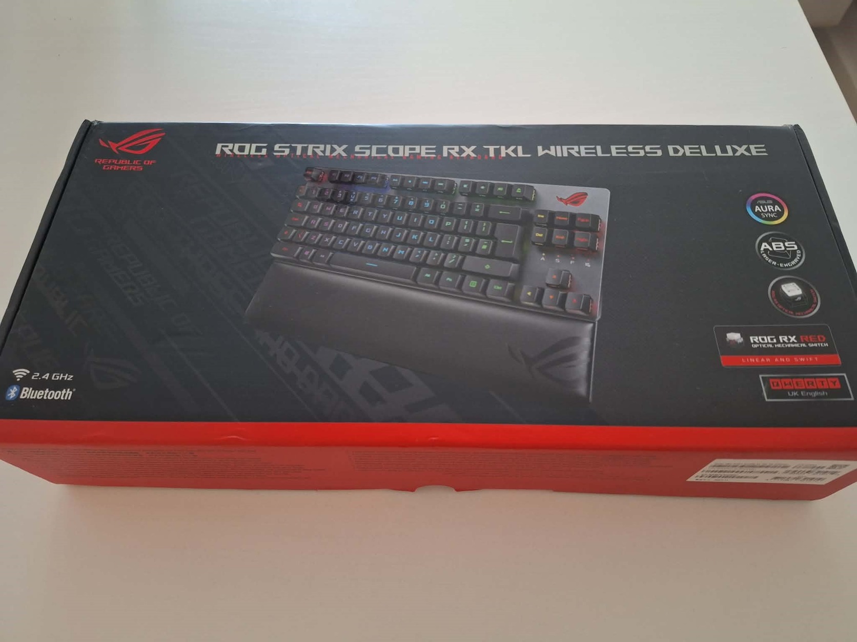ROG Strix Scope RX TKL Wireless Deluxe gamer billentyűzet FPS-játékosoknak három kapcsolódási móddal, ROG RX optomechanikai kapcsolók, széles Ctrl billentyű, Aura Sync RGB, mágneses csuklótámasz és fémötvözet felső lemez.