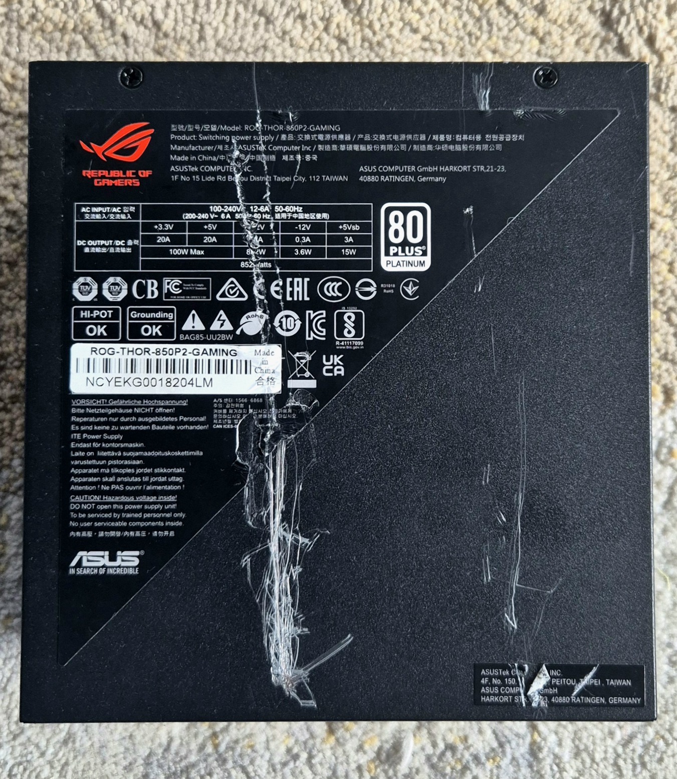 Asus ROG THOR 850W Platinum II táp, tökéletes működéssel, sajnos be-kiszerelésnél a teteje öszzekarcolva a képek szerint. Kábelek: