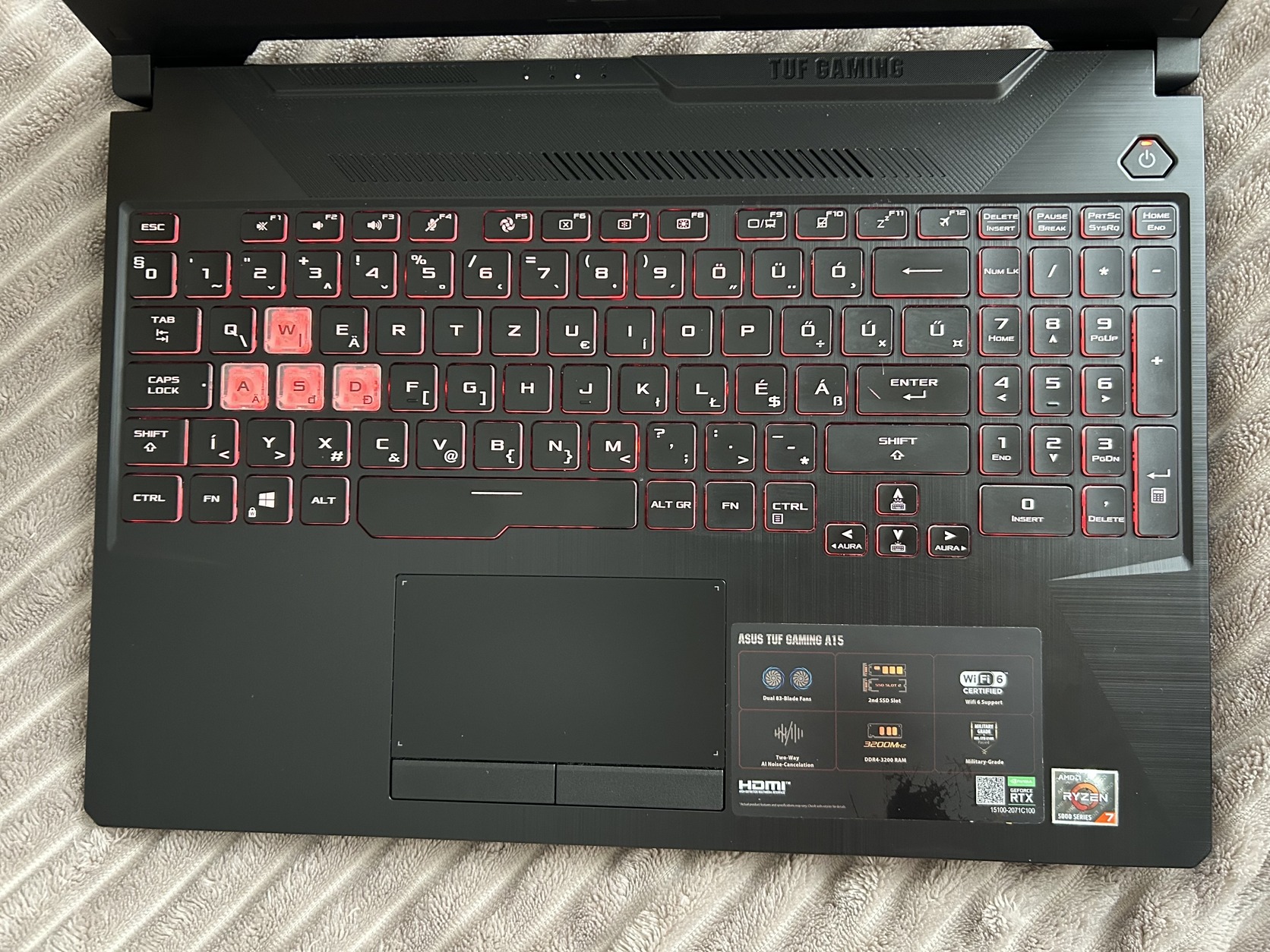 A információs matrica a touchpad mellett megkopott.