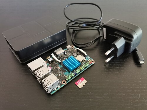 Eladó egy Asus Tinker Board, műanyag házzal, hűtőbordával, tápegységgel. (A képen látható microsd kártya nem eladó)