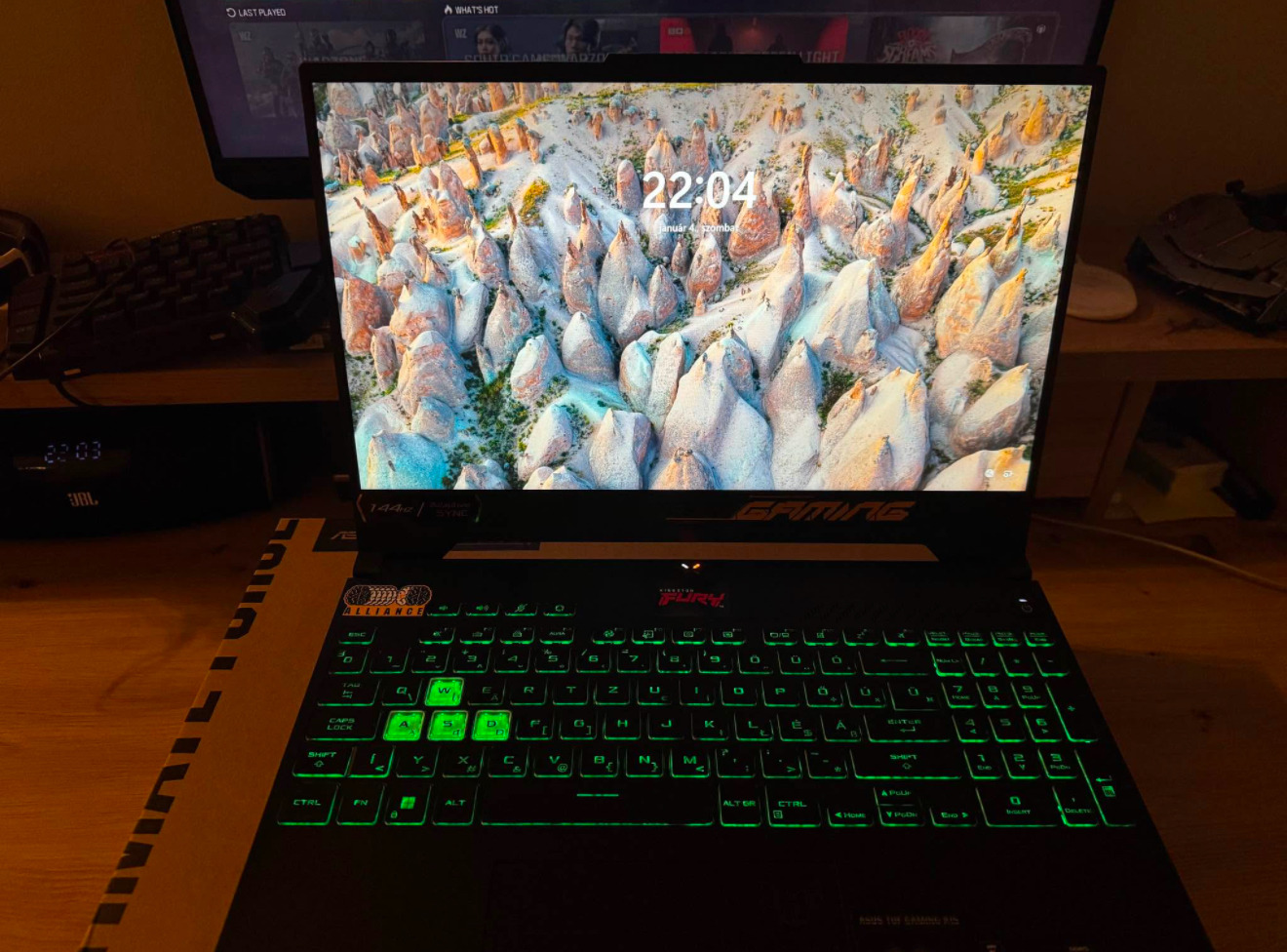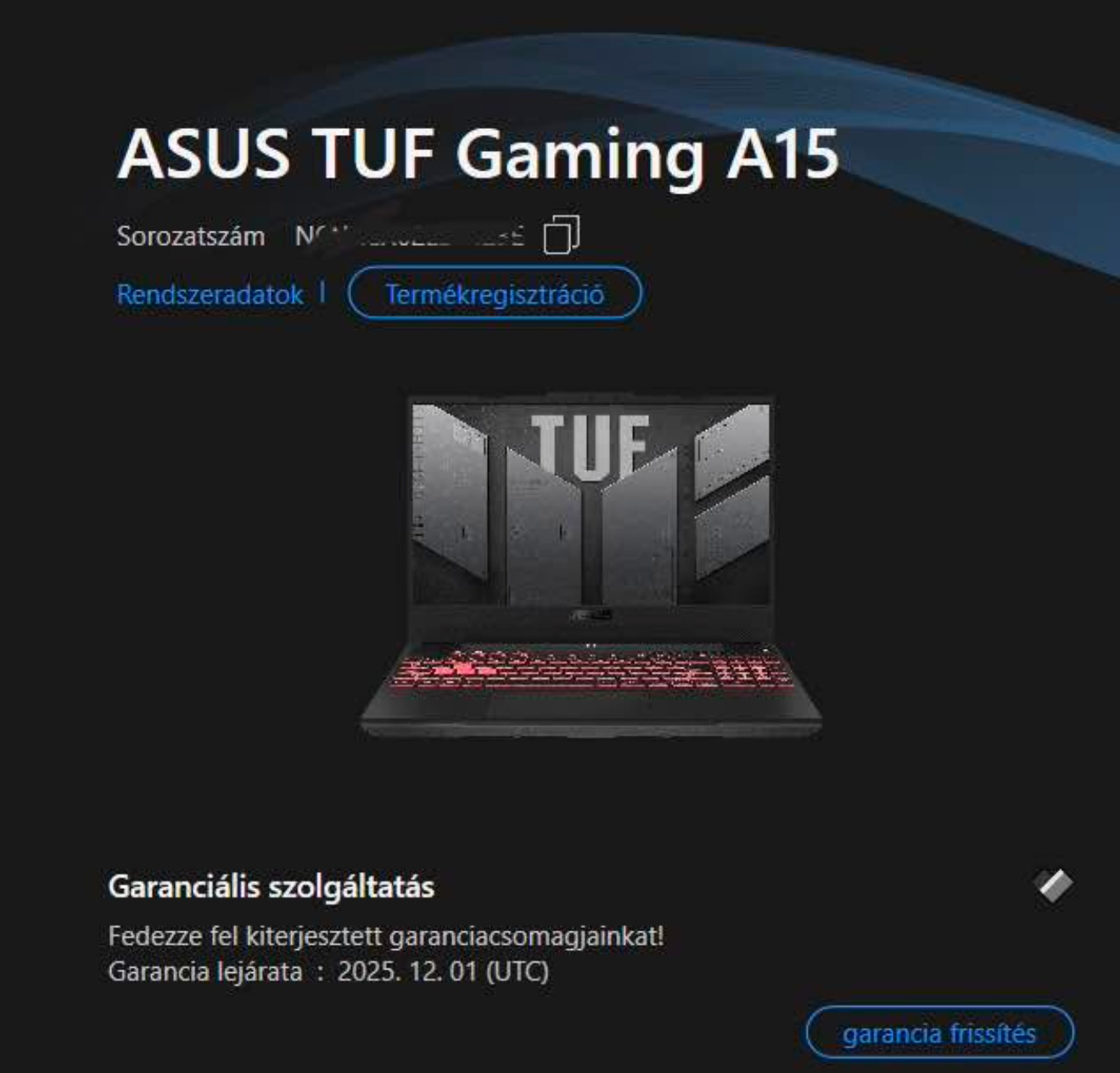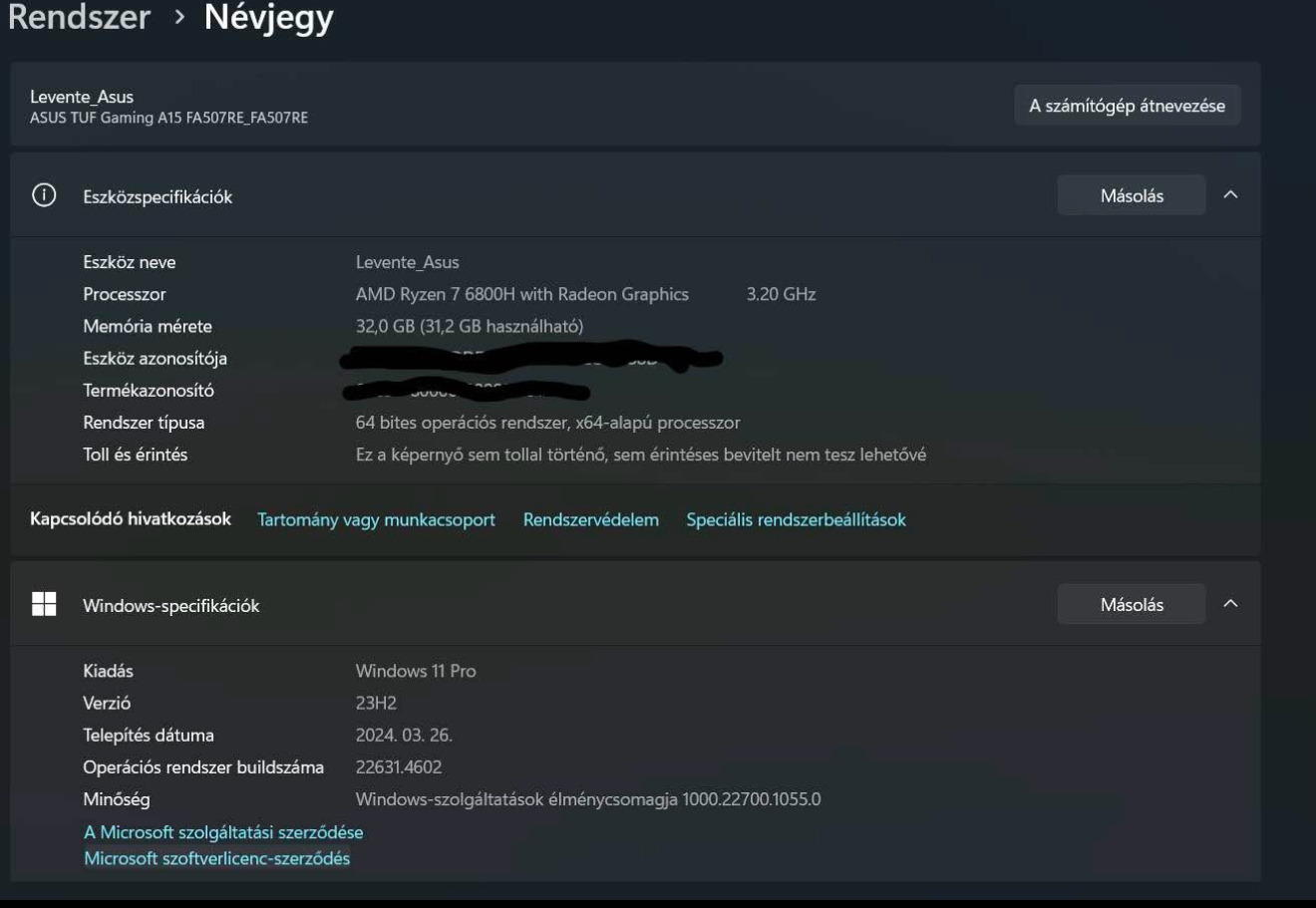 Gyarilag 16Gb ram volt ezt kicsereltem 2x16gb fury ramokra. eredeti windows 11 pro license a géphez aktiválva. Amd ryzen 7 6800H proceszor Nvidia RTX 3050 Ti 4gb videokártya (3050Ti ból a legerösebb van benne) 500 gb ssd 144hz 1080p monitor Ddr5 kingston fury ram 32Gb