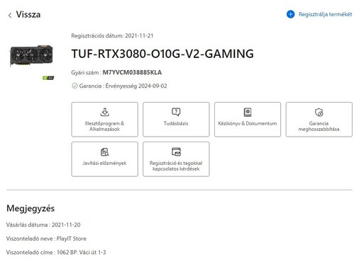 270w power limit mellett, 83-85 fokos memóriával dolgozott.2021.11.20-án a Playit Storeban lett vásárolva magánszemélyként, 2024.09.02-ig szól a gyártói garancia (vásárlás után Asusnál beregisztrálva).