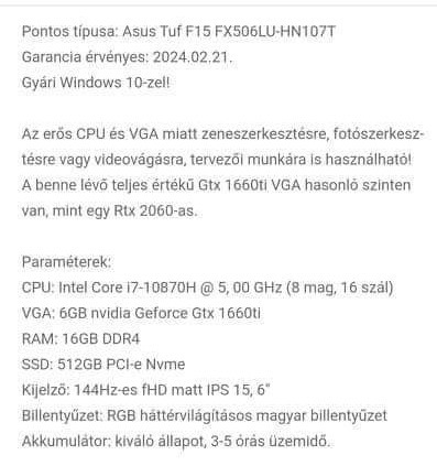 Grafikus vezérlőNVIDIA® GeForce™ GTX 1660Ti 6GB GDDR6Kijelző15.6" FullHD (1920 x 1080) WideView matt LCD (144Hz)Képfrissítés144 HzFényerő250 nitLAN típus1000MbpsWi-Fi802.11 axBluetoothv 5.1HDMI normál1 dbUSB 2.01 dbUSB 3.02 dbUSB3.1 Type-C1 dbOptikai meghajtóUSB (vásárolható)BillentyűzetVilágítás, Magyar kiosztásúAudio leírásBeépített hangszórók (2db 2W), DTS:X® UltraWebkameraHD Webkamera (beépített)Akkumulátor leírás3 cellás 48Whr beépítettExtrákVR Ready