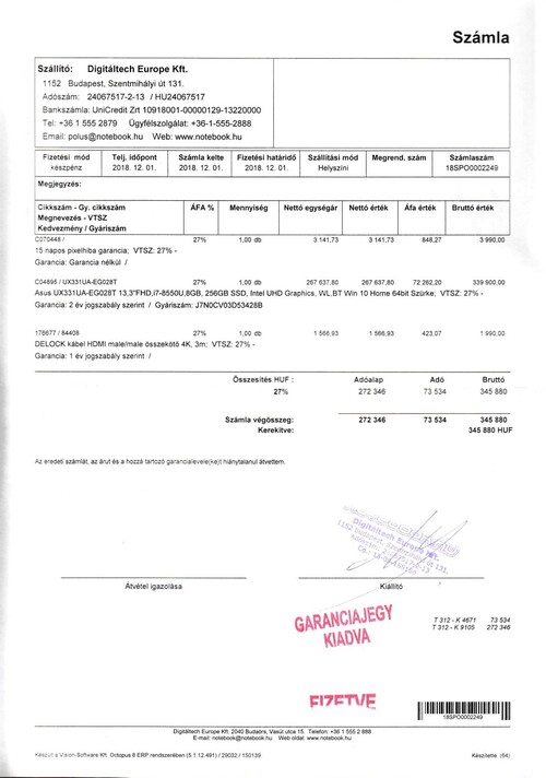 13" FHD, Intel® Core™ i7-8550U Processor 1.8 GHz (8M Cache, up to 4.0 GHz, 4 cores), 8GB, 256GB SSD, UHD Graphics 620, világító magyar billentyűzet, eredeti Win10