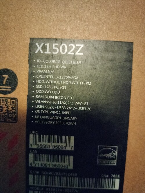 Intel® Core™ i3-1220p processzorIntel® UHD Graphics grafikus vezérlő 15,6" FHD (1920 x 1080) felbontás, 16:9 képarány, 60 Hz képfrissítés, 200 nit fényerő, matt LCD kijelző8 GB DDR4 on board memória (bővíthető) 128 GB M.2 NVMe™ PCIe® 3.0 SSD tárhely1 db USB 2.0 Type-A1 db USB 3.2 Gen 1 Type-C2 db USB 3.2 Gen 1 Type-A1 db HDMI 1.41 db 3,5 mm Combo Audio Jack1 db DC-in720p HD kamera
