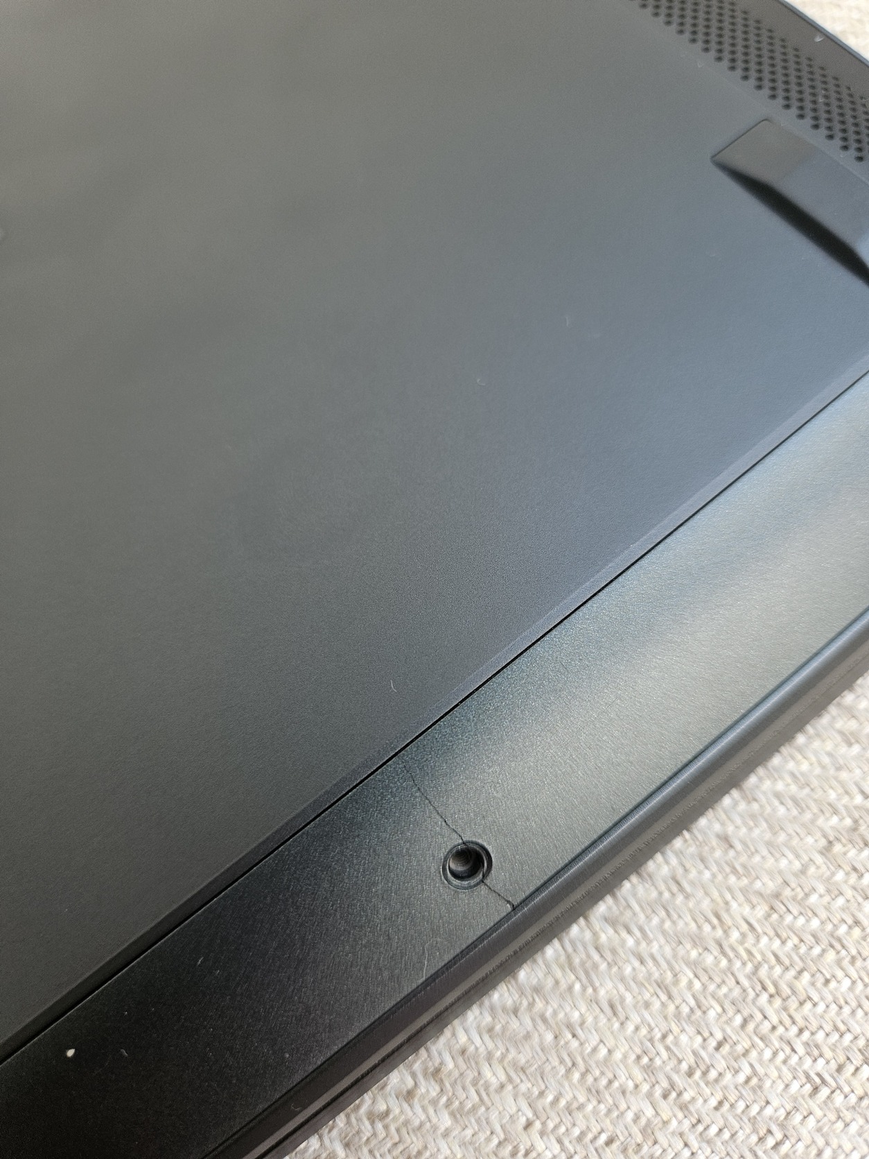 A laptop alján hiányzik egy csavar és a menetnél meg van repedve (szintén képen)