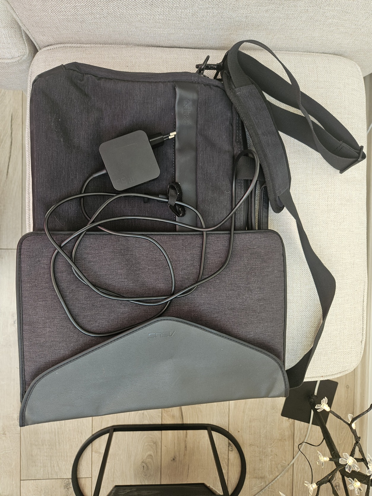 Az árba a laptop mellé bele tartozik egy vállra akasztható laptop táska (2 nagyobb cipzáras zsebbel és két kissebbel a külső oladalakon), egy tépőzáras védő tasak ( szintén asus márkájú, a laptop saját védő tasakja), illetve a laptophoz tartozó gyári töltő.