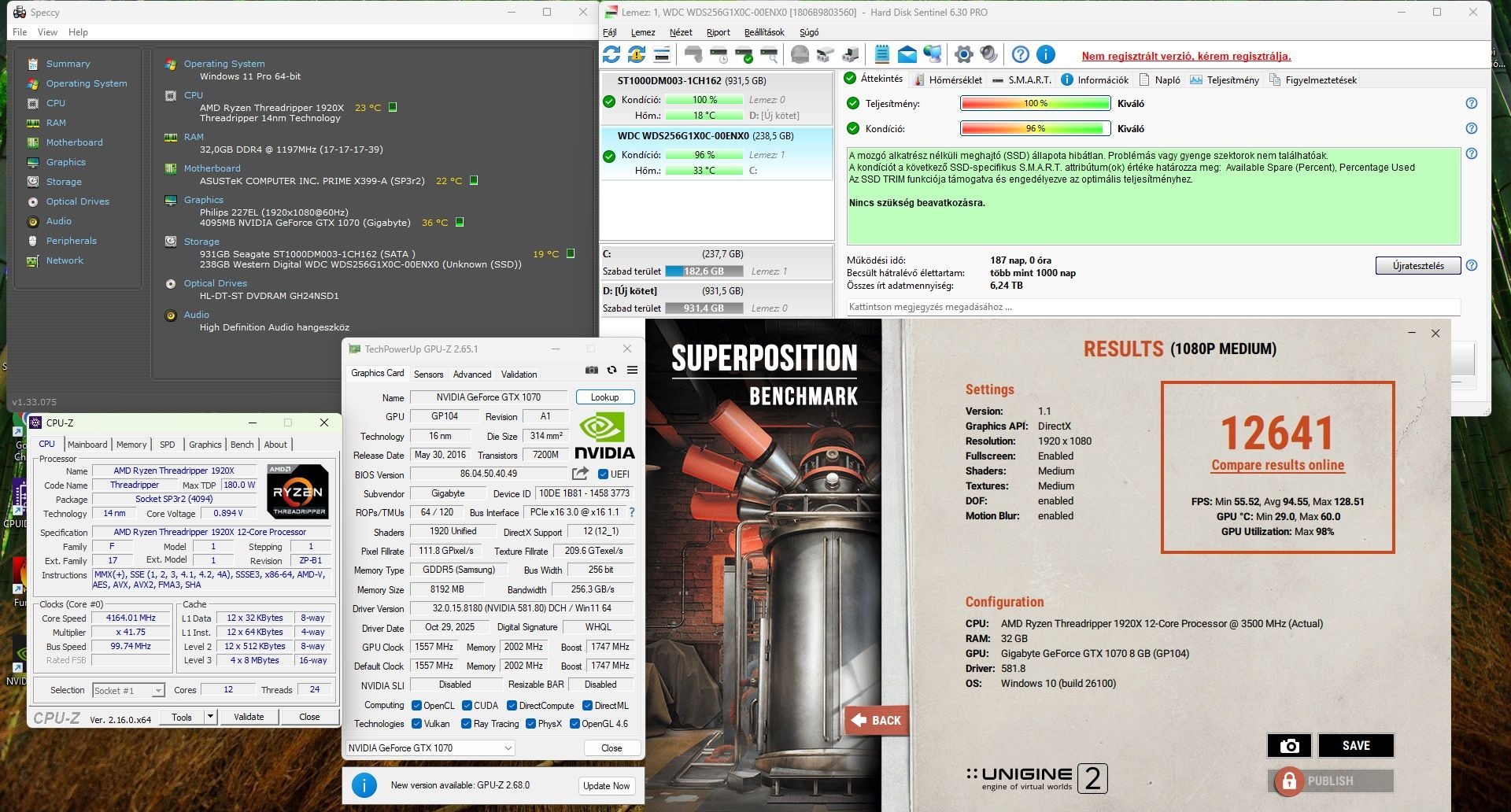 Asztali PC / Ryzen Threadripper 1920X / 32GB DDR4 / GTX 1070 8GB / 256GB SSD / 1TB HDD / Win11