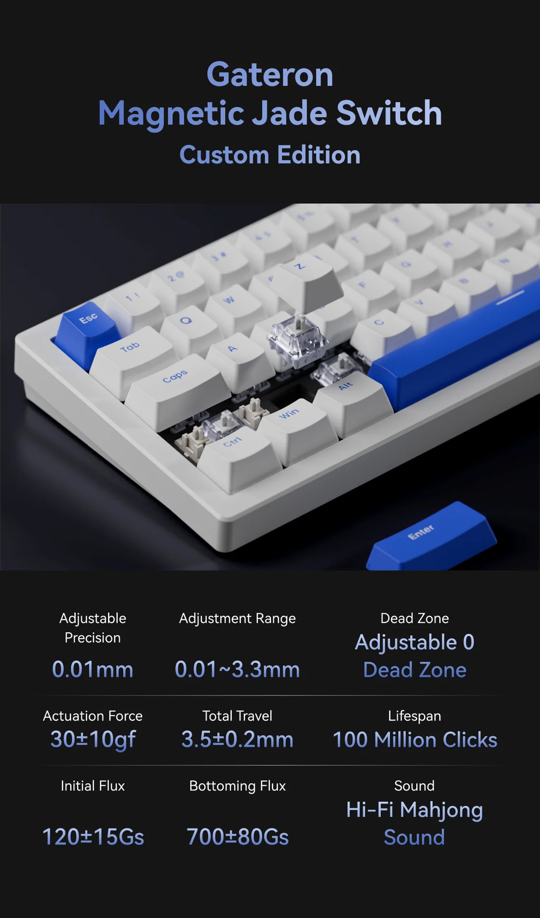 Mágneses switchek vannak benne, ezáltal nem 2 állása van a billentyűnek, hanem számít milyen érősen van lenyomva. 8K Polling rate, 0.125ms válaszidő, RT Range: 0.01-0.33mm, elég csak rágondolni a billentyűre, már érzékeli is, persze minden állítható rajta, van külön szoftvere, RGB világítással rendelkezik, doboza megvan, hibátlan és makulátlan, nincs nálam fél éve se.