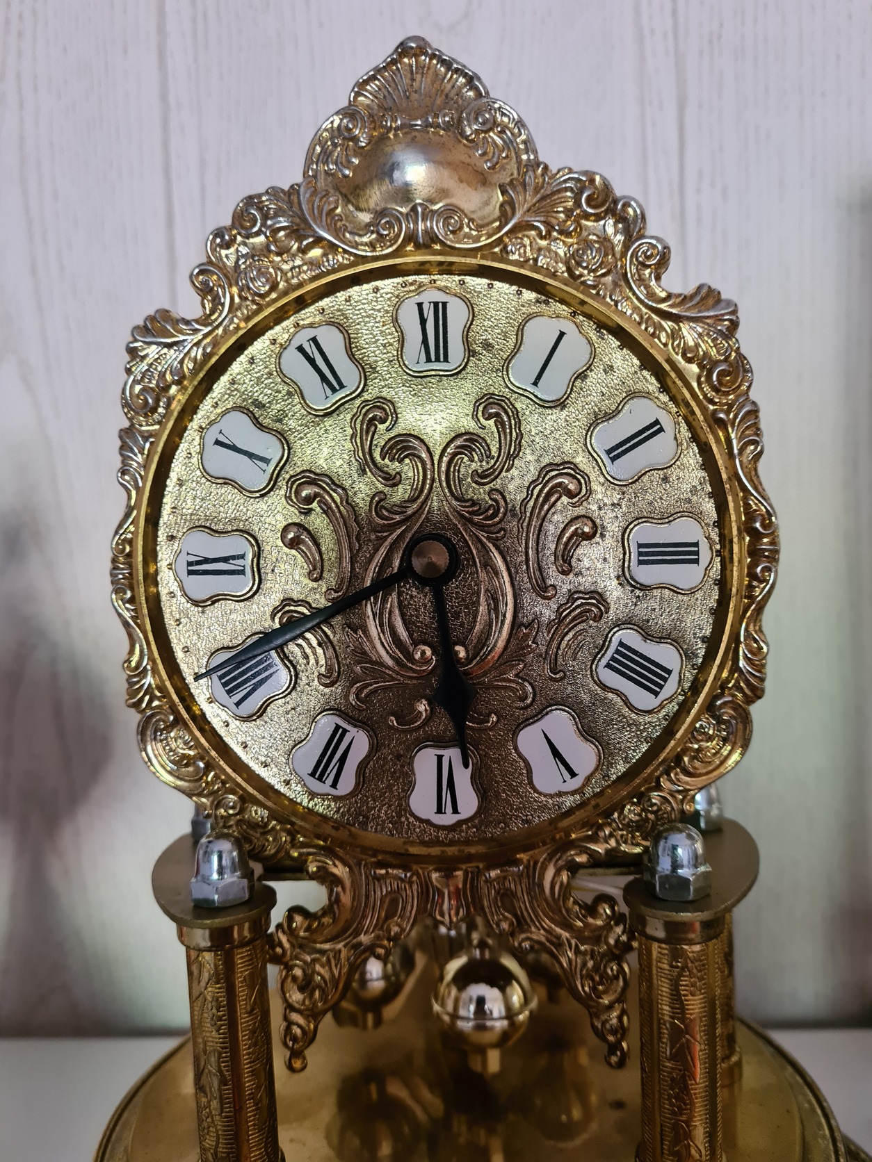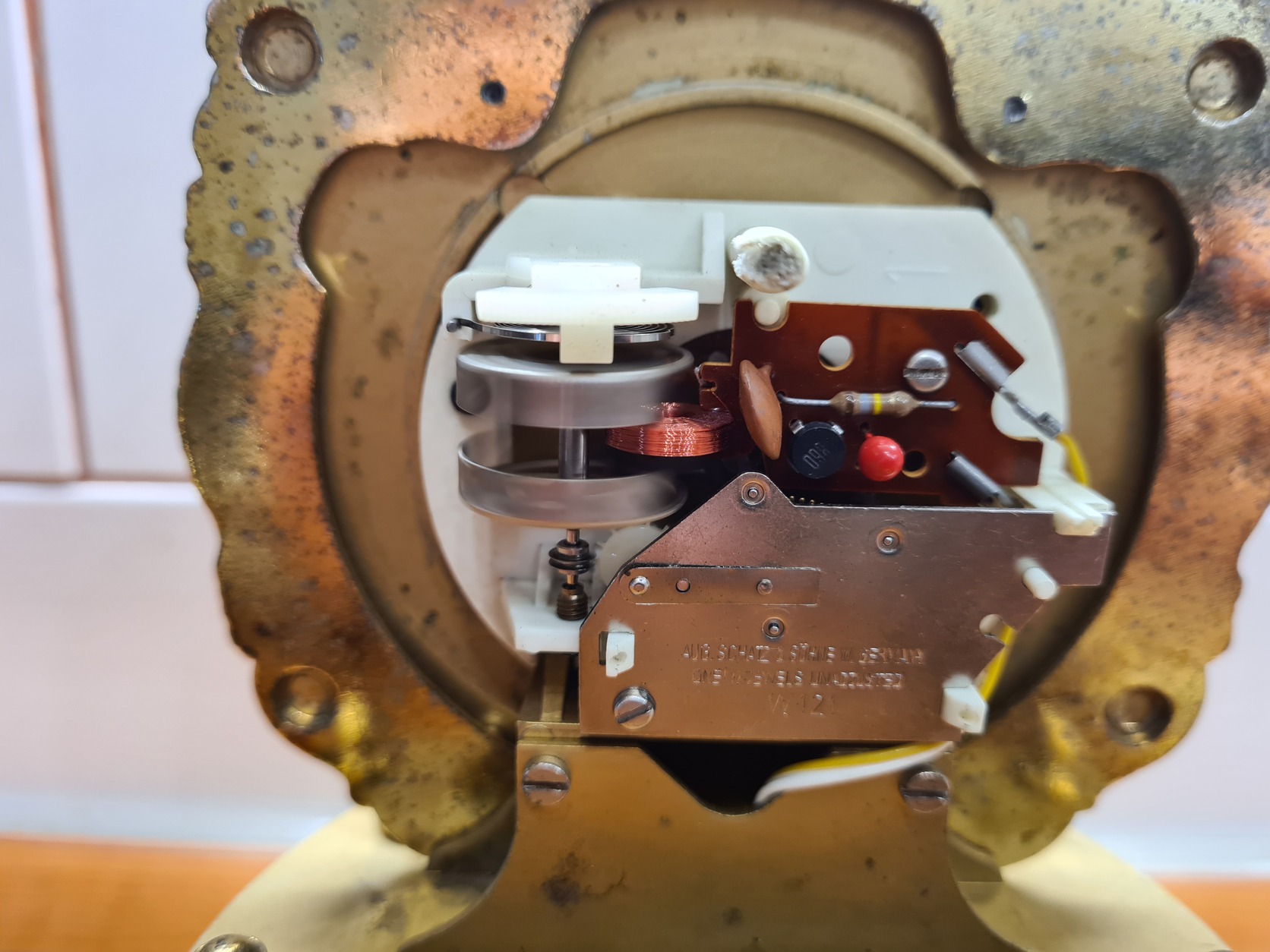 Sajnos a műanyag meghajtó szerkezet az eredeti réz ingát nem bírja forgatni, ezért műanyag ingával lett helyettesítve.