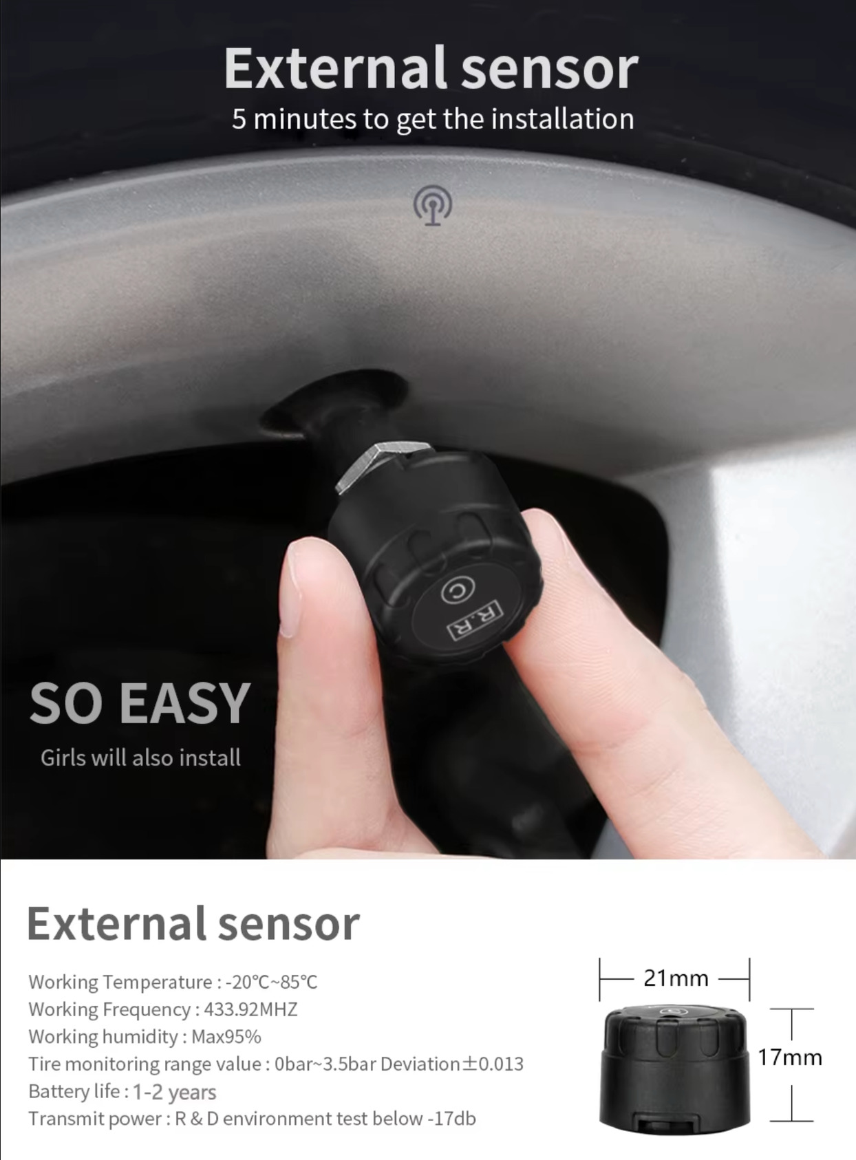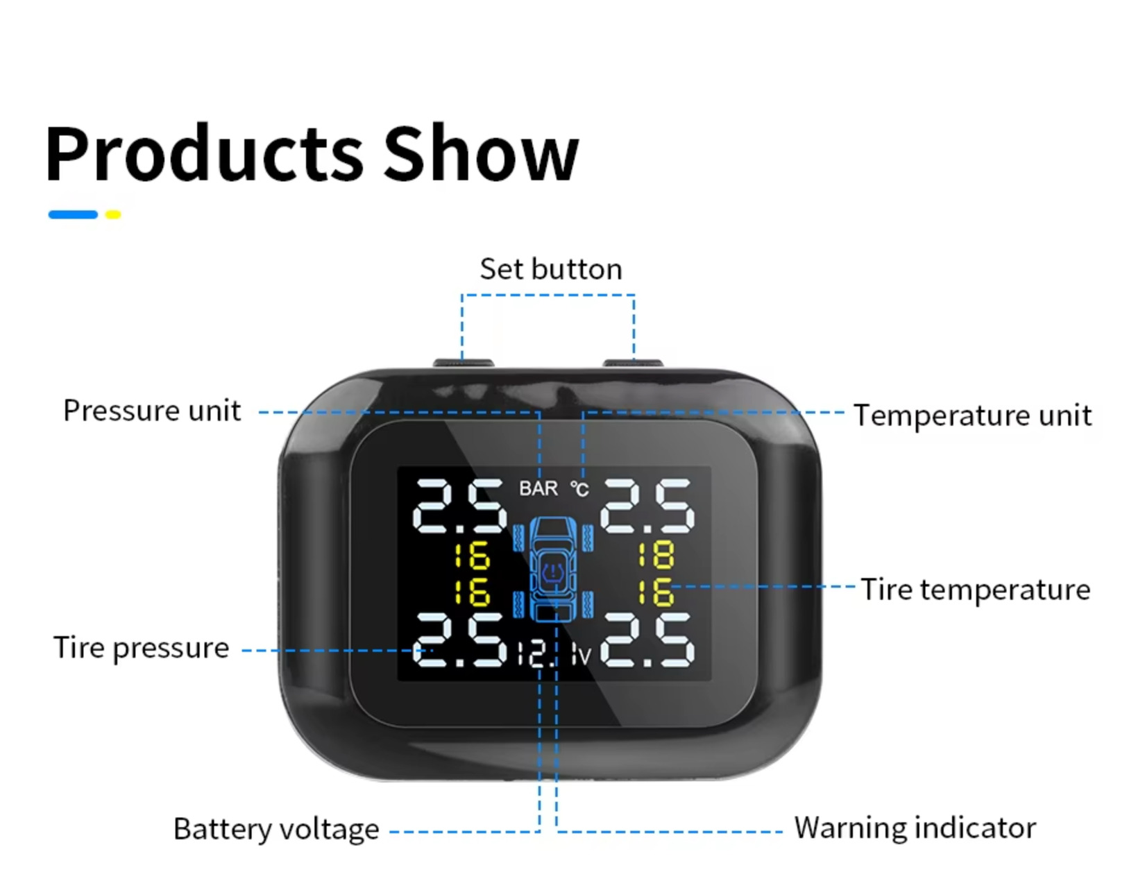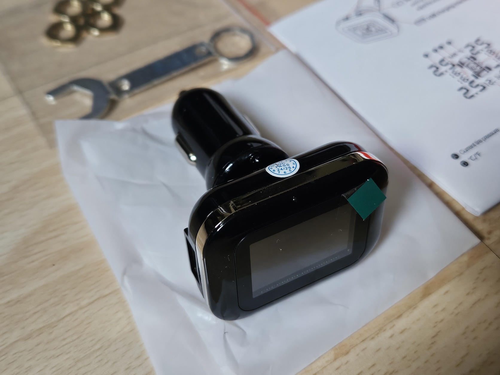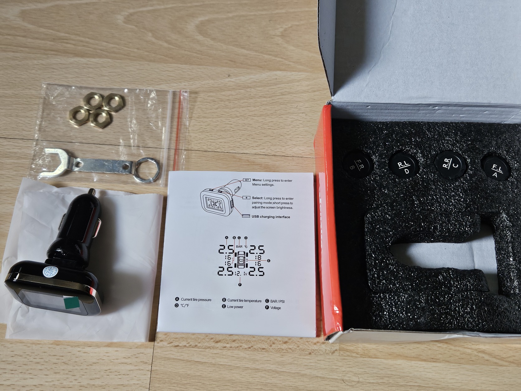 Az eszköz segítségével - ami bluetooth-on kapcsolódik a szelepekbe szerelt 4db szenzorhoz- folyamatason figyelhető a keréknyomás, a gumi hőmérséklet, és figyelmeztet ha abnormális értékeket érzékel.