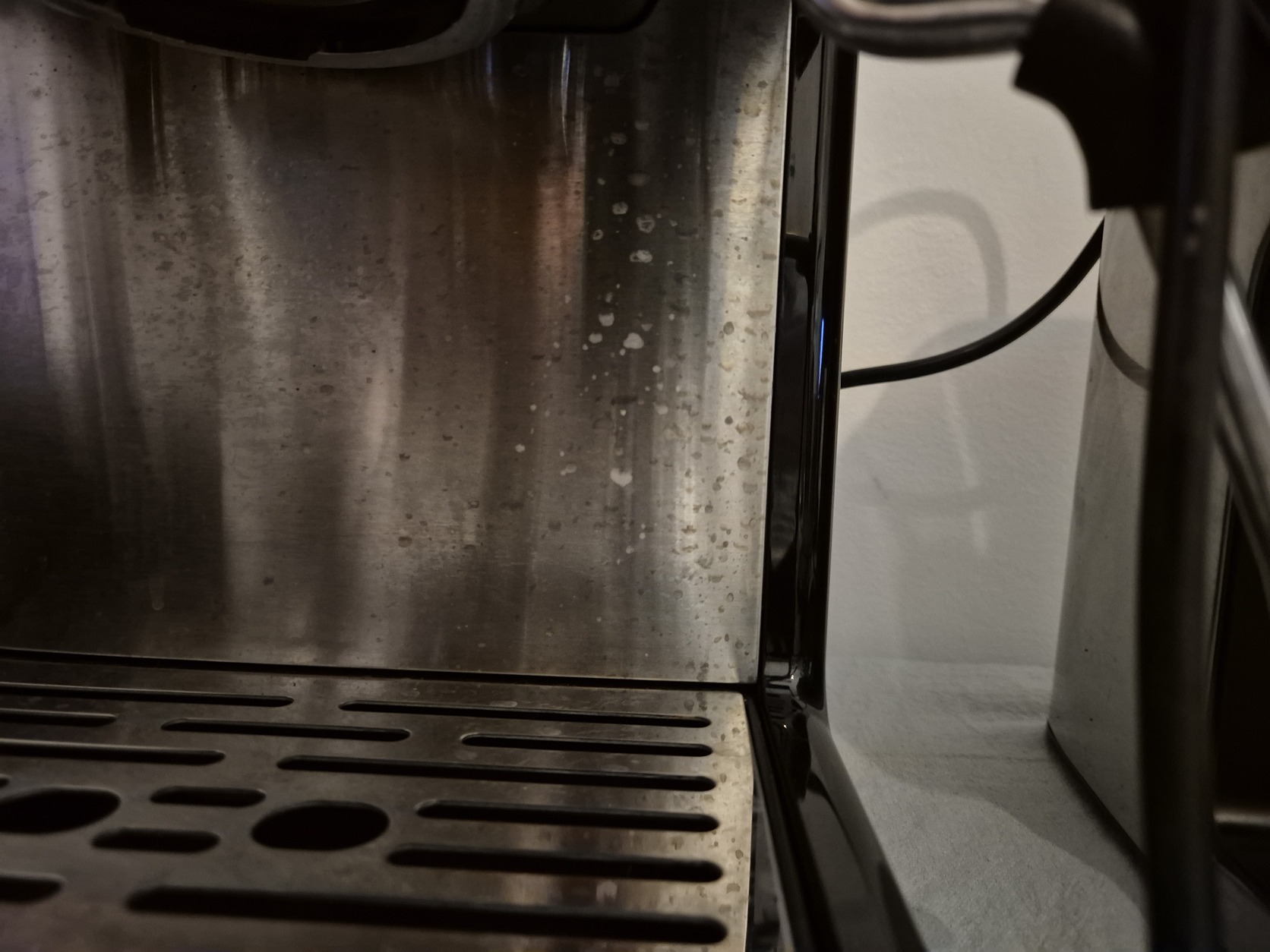 A kávégép fém felületén látható kis pöttyök egy korábbi vízkőtelenítésnél képződtek, sajnos kicsapott a vízkőtelenítés közben a vegyszeres gőz. Ennek megfelelően áraztam be.